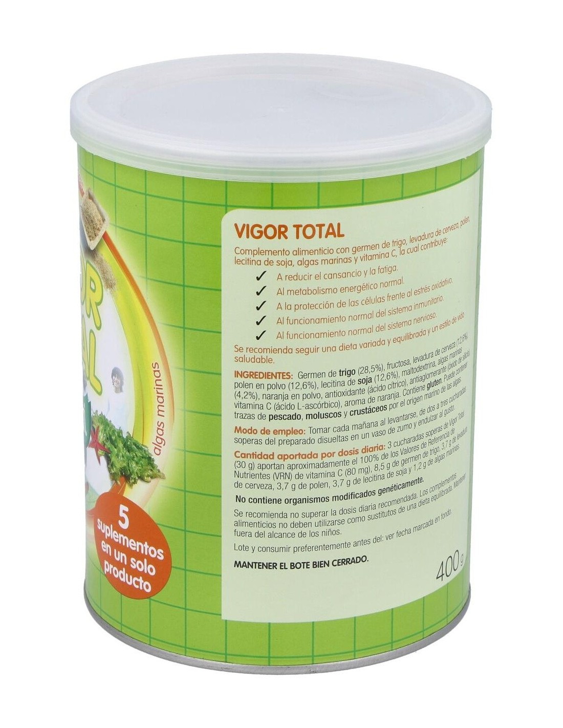 Germen de trigo (28,5%), fructosa, levadura de cerveza (12,6%), polen en polvo (12,6%), lecitina de soja (12,6%) maltodextrina, algas marinas (4,2%), naranja en polvo, antioxidante (ácido cítrico), antiaglomerante (óxido de silicio), vitamina C. Soya no OMG. Contiene gluten, pescado* y crustáceos*