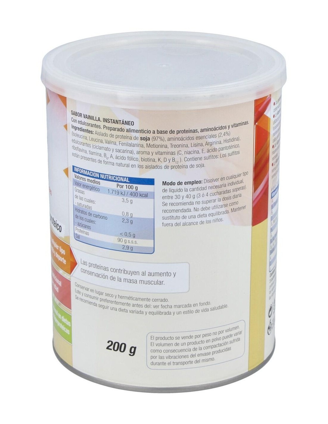 Aislado de proteína de soja (97%), aminoácidos esenciales (2,4%) (isoleucina, leucina, valina, fenilalanina, metionina, treonina, lisina, arginina, histidina), edulcorantes (ciclamato y sacarina), aroma y vitaminas (C, niacina, E, ácido pantoténico, riboflavina, tiamina, B6, A, ácido fólico, biotina, K, D y B12).