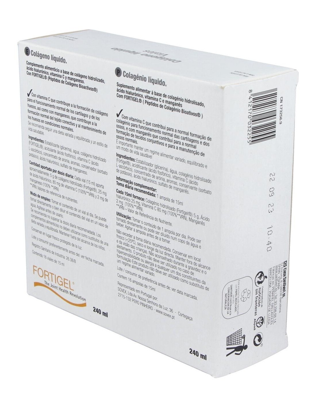 5 g de colágeno hidrolizado (Fortigel®), 25 mg de ácido hialurónico, 80 mg de vitamina C (100% VRN) y 2 mg de manganeso.