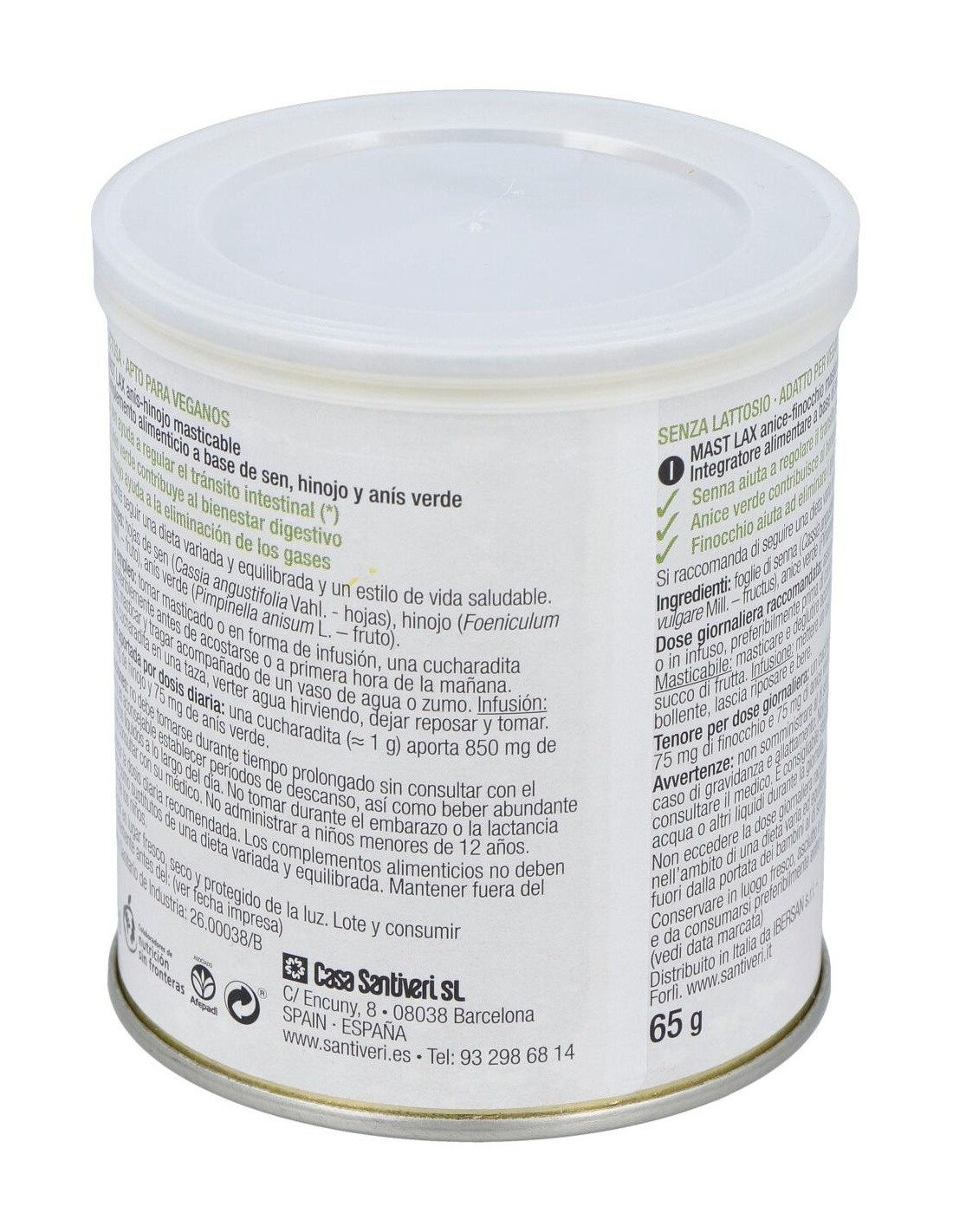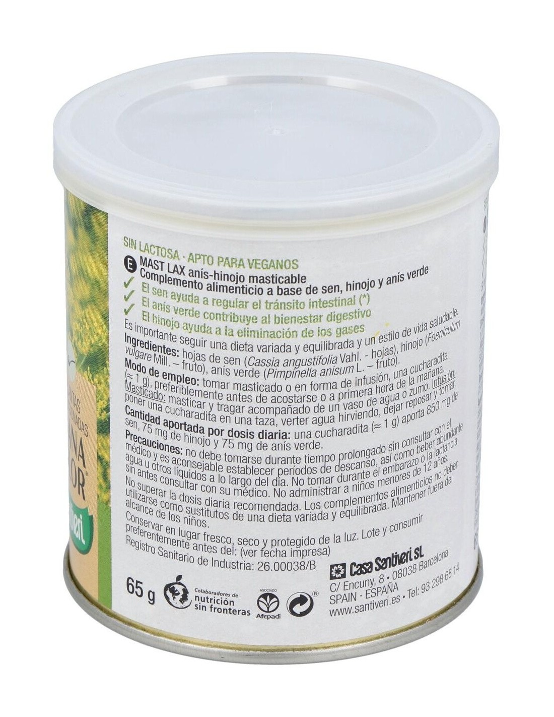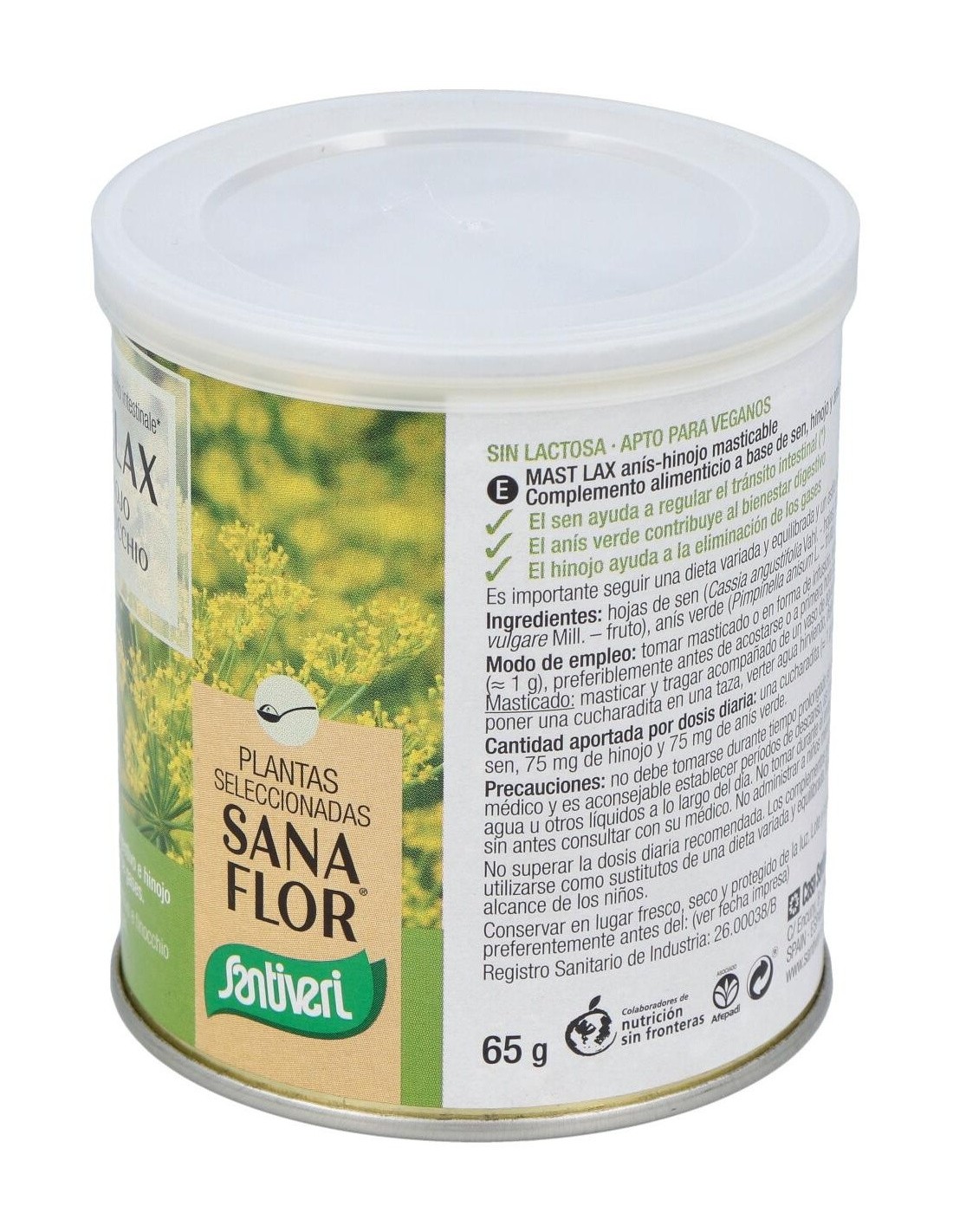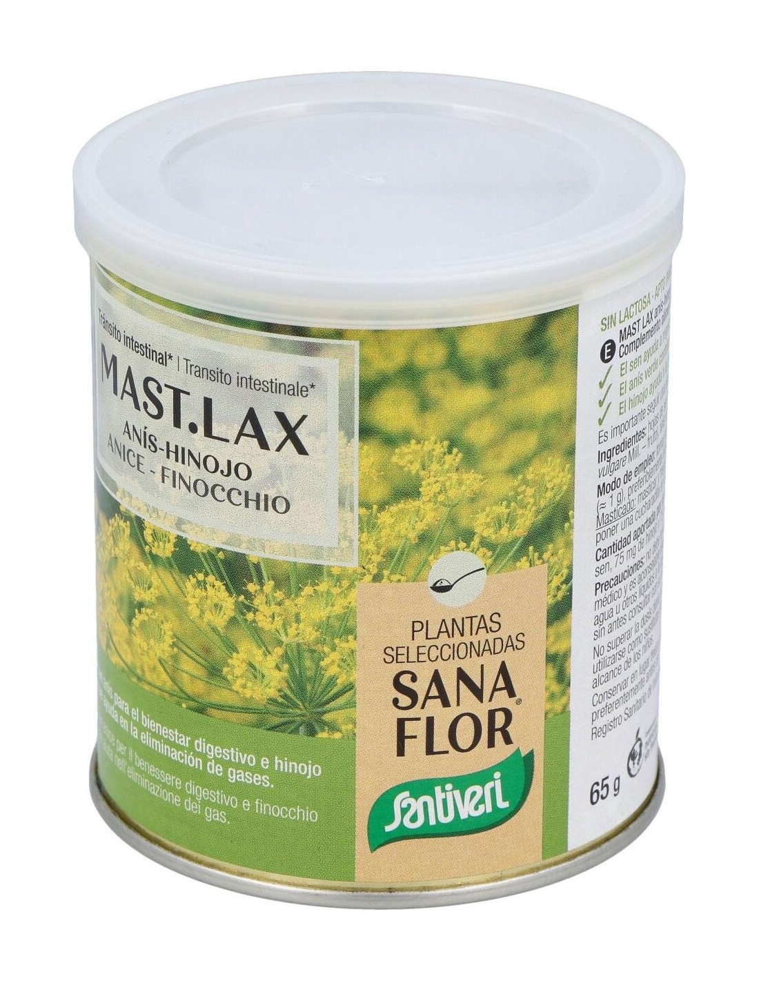 SANTIVERISantiveri Sanaflor Bote Mast-Lax Gases 65gr es un complemento alimenticio diseñado para estimular el tránsito intestinal y proteger la flora bacteriana.Colabora en los problemas gástricos.