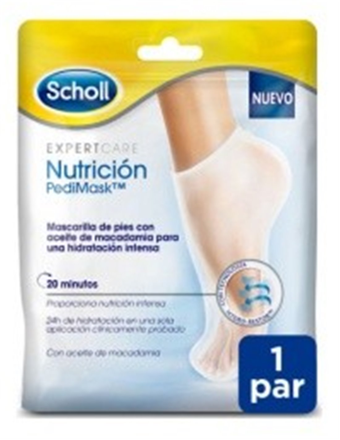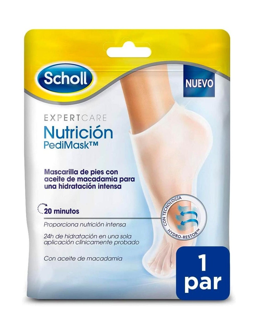 SCHOLLEstá clínicamente probada para proporcionar hidratación intensa y duradera a los pies en tan solo 20 minutos. Consigue hasta 24 horas de hidratación en una sola aplicación gracias a la tecnología Hidro-RestoreTM de Scholl. Esta mascarilla hidratante para pies está formada por tres tipos de componentes para garantizar los resultados clínicamente probados:\ - Componente oclusivo: crea una barrera física para prevenir la pérdida de agua.\ - Componente humectante: atrae y retiene la humedad dentro de las capas secas externas de la piel.\ - Componente emoliente: rellena los vacíos y suaviza la piel.