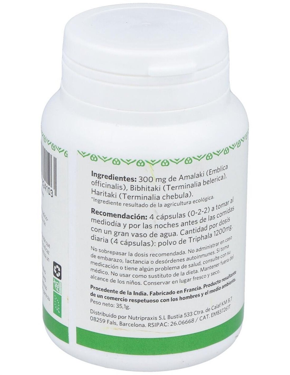 Complemento alimenticio a base de Triphala con certificación ecológica. Extracto natural