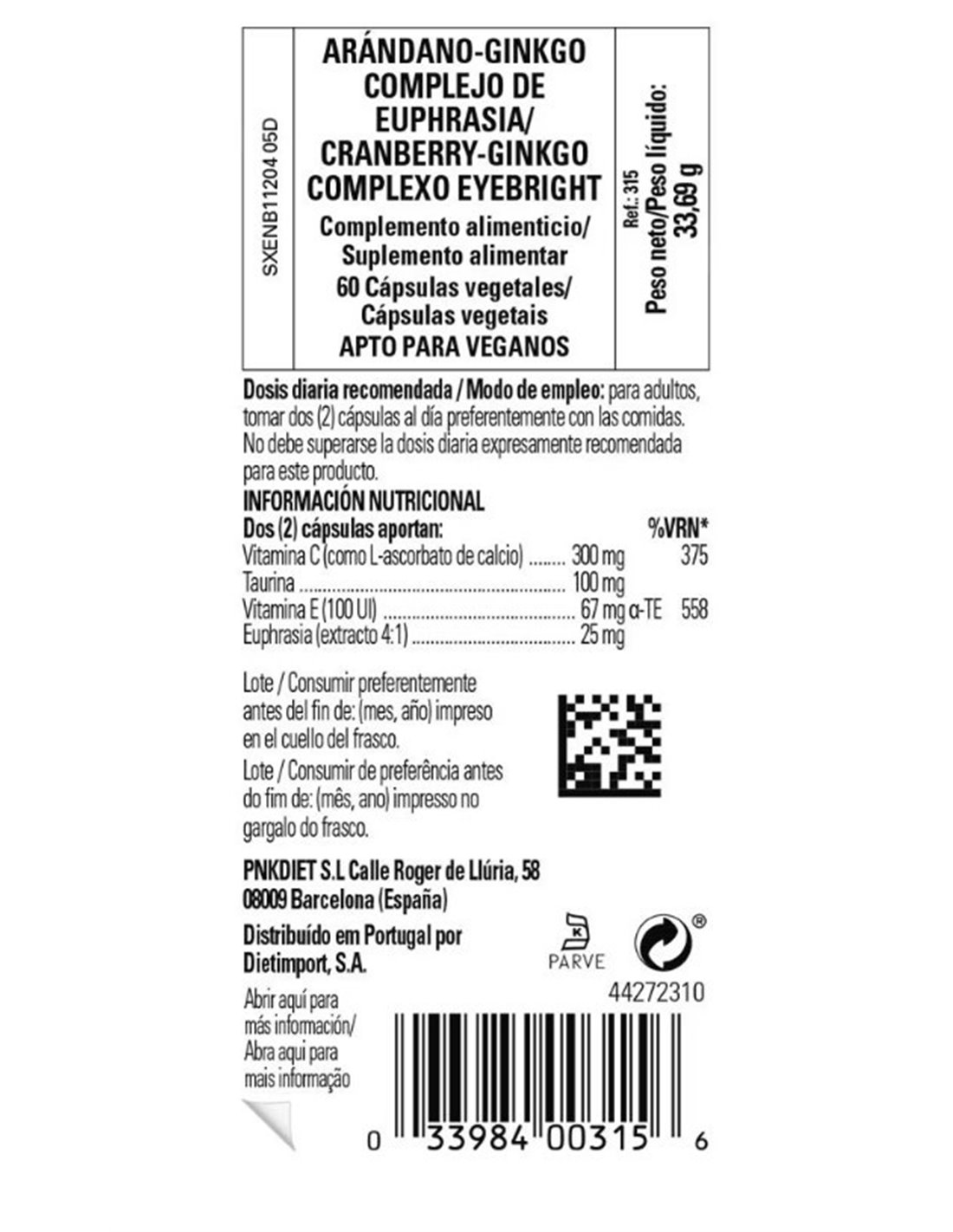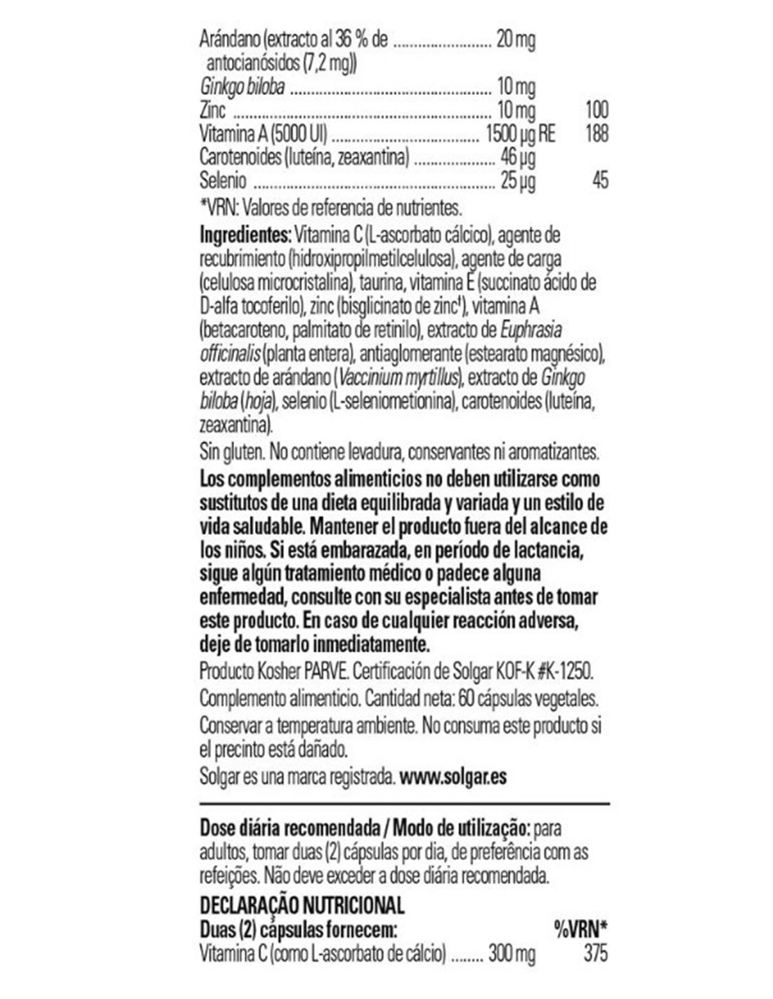 Por 2 cápsulas:\ Vitamina A (como betacaroteno y palmitato de retinilo) 1.500 mcg \ Vitamina C (como ascorbato de calcio) 300 mg \ Vitamina E (como succinato de ácido D-alfa tocoferilo) 67 mg\ Zinc (como glicinato de zinc) 10 mg \ Selenio (como L-selenometionina) 25 mcg \ Extracto de Eufrasia (planta entera) (4:1) 25 mg \ Extracto de arándano (baya) (antocianósidos 36% [7,2 mg]) 20 mg \ Extracto de hoja de Ginkgo (glucósidos de flavona de ginkgo 24% [2,4 mg]) 10 mg \ taurina 100 mg\ Mezcla de carotenoides (alfa y betacaroteno, luteína, zeaxantina, licopeno, criptoxantina) 46 mcg\ Celulosa vegetal, Estearato de magnesio vegetal, Celulosa microcristalina, Caramelo (color), Maltodextrina.