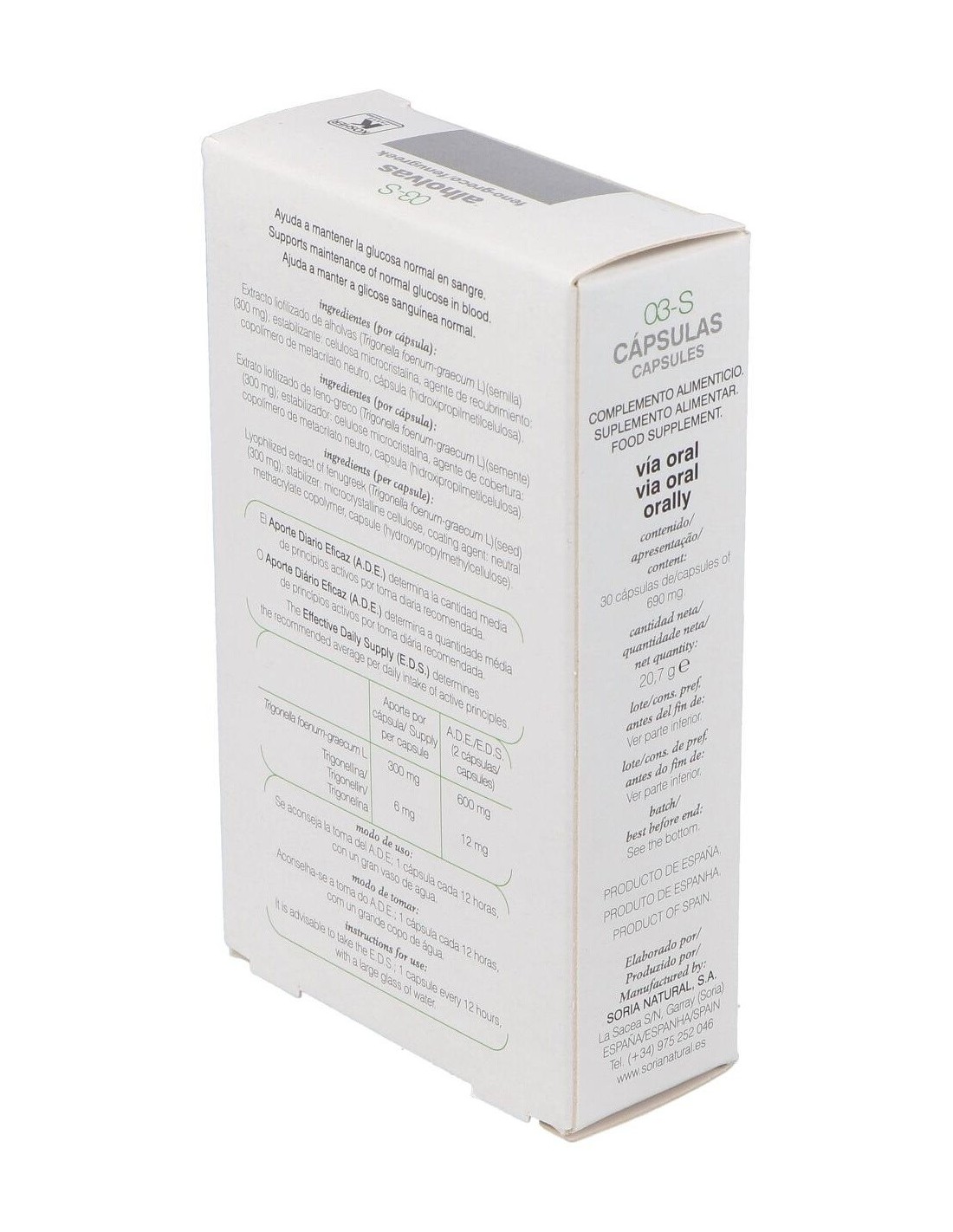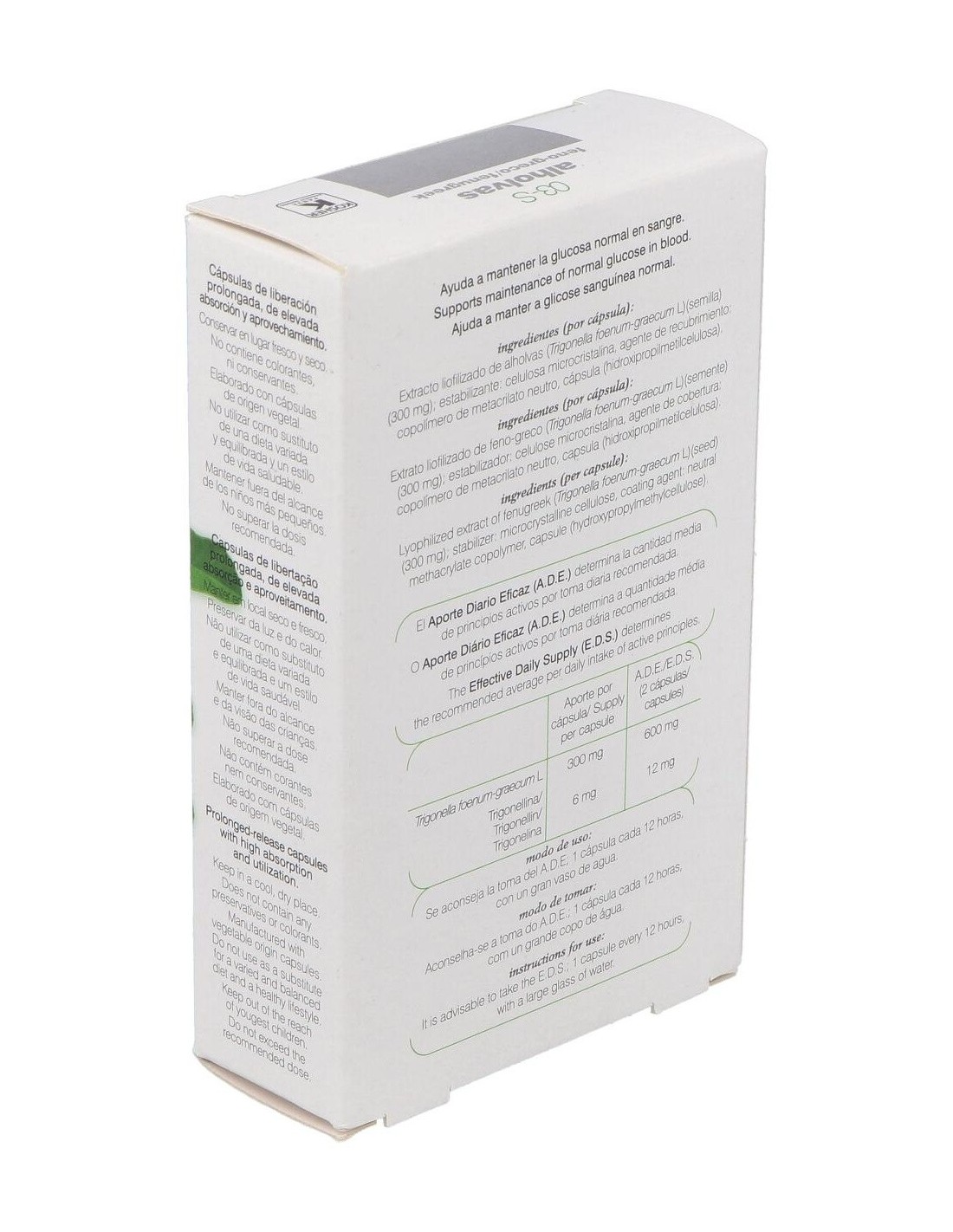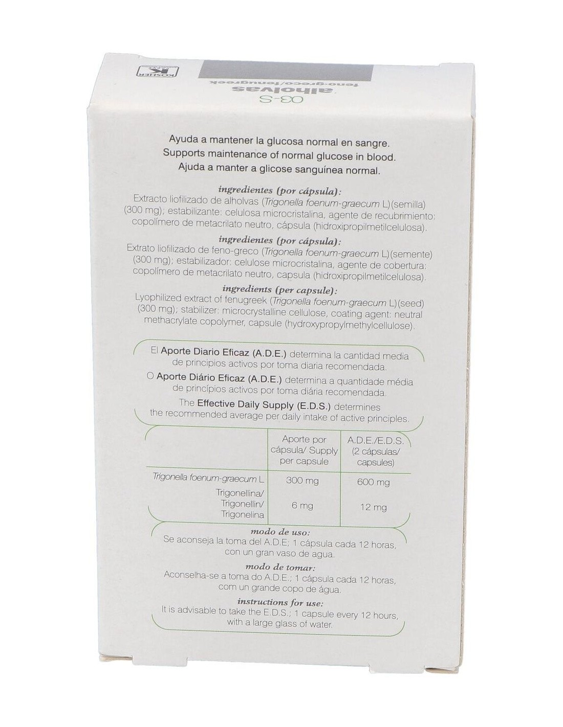 Complemento alimenticio que ayuda a regular los niveles de glucosa en el organismo. Las semillas del fenogreco (alhovas) son empleadas popularmente para el tratamiento de la obesidad y la diabetes. Entre sus componentes, destacan las saponinas esteroides y la fibra mucilaginosa a las que se atribuyen sus efectos beneficiosos. Entre las saponinas esteroídicas, la fenogrekina interviene en la regulación de las secreciones pancreáticas. Además parece que las saponinas esteroídicas inhiben la absorción y la síntesis del colesterol.