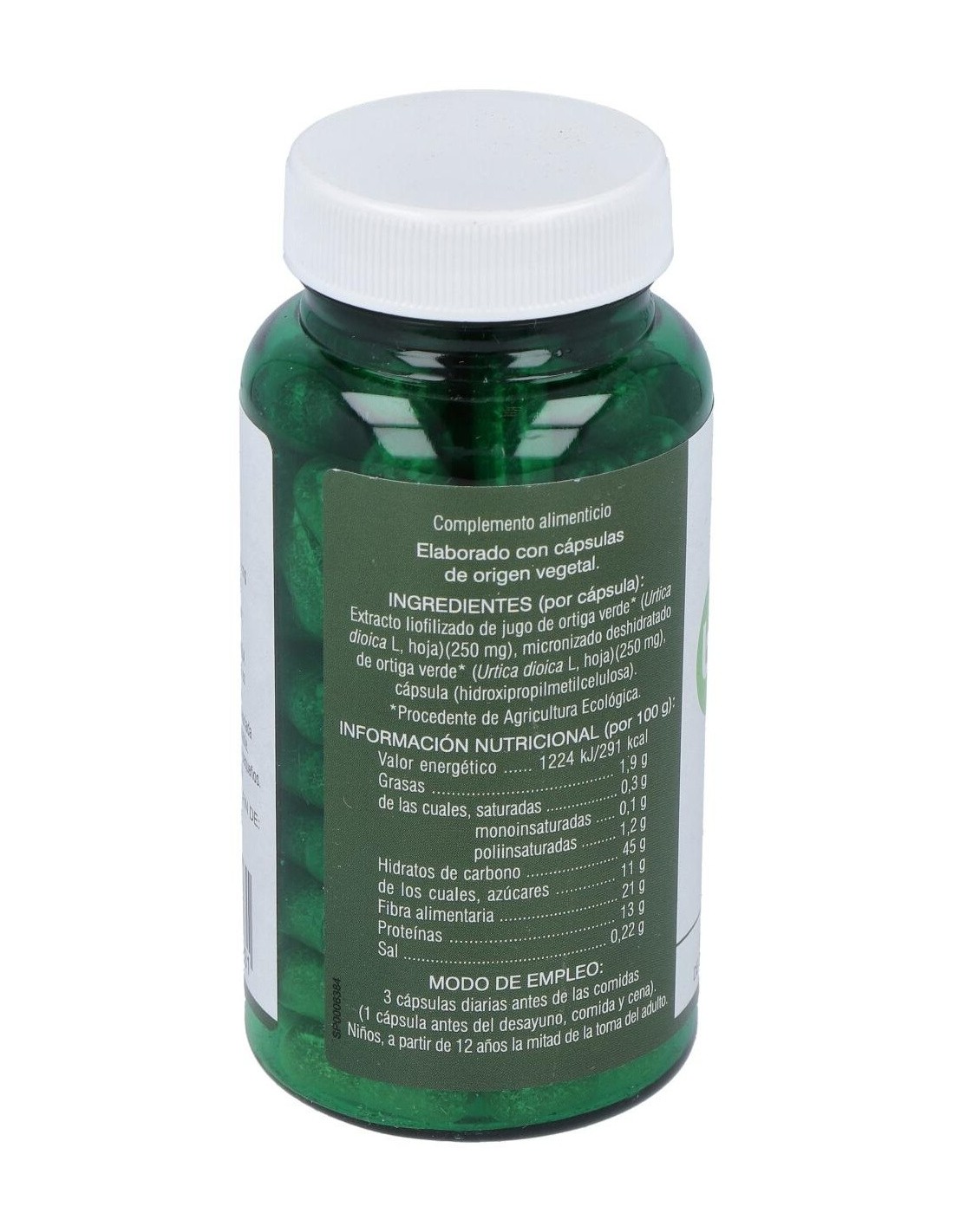 Jugo deshidratado de ortiga verde recién recolectada (85%), Almidón de arroz, Celulosa.