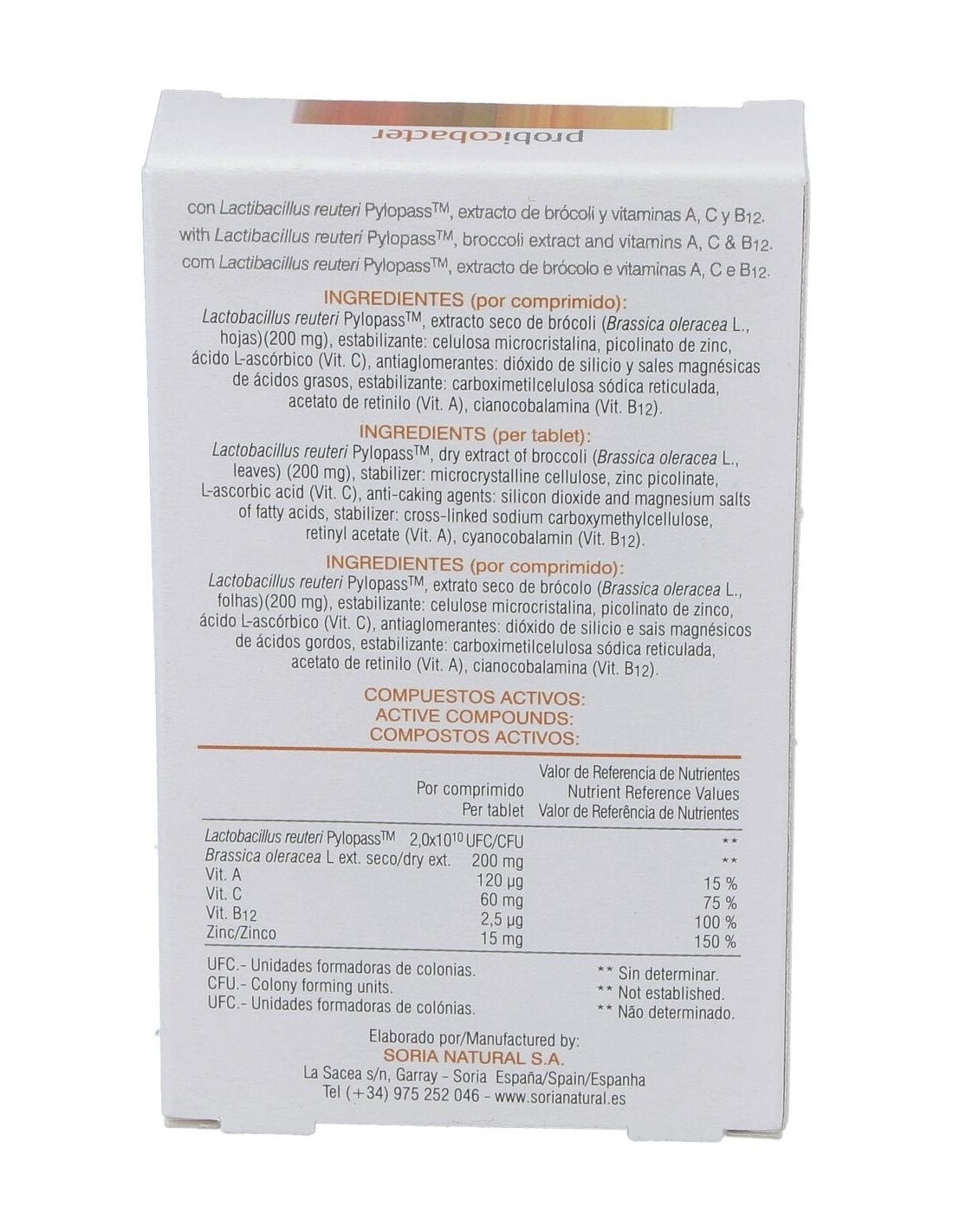 Por 1 comprimido: Lactobacillus reuteri PhylopassTM, extracto seco de brócoli (Brassica oleracea L., hojas) (200 mg), estabilizante: celulosa microcristalina, picolinato de zinc, ácido L ascórbico (Vit. C), antiaglomerantes: dióxido de silicio y sales magnésicas de ácidos grasos, estabilizante: carboximetilcelulosa sódica reticulada, acetato de retinilo (Vit. A), cianocobalamina (Vit. B12).