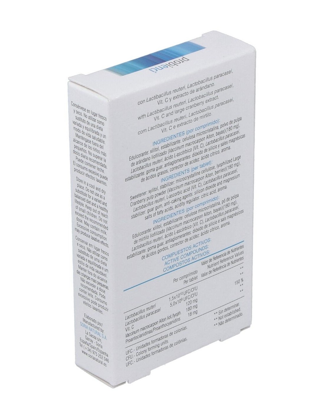 Edulcorante: xilitol, estabilizante: celulosa microcristalina, polvo de pulpa de arándano liofilizado (Vaccinum macrocarpon Aiton, bayas) (180 mg), Lactobacillus reuteri, ácido L-ascórbico (Vit. C), Lactobacillus paracasei, estabilizante: goma guar, antiaglomerantes: dióxido de silicio y sale magnésicas de ácidos grasos, corrector de acidez: ácido cítrico, aroma.