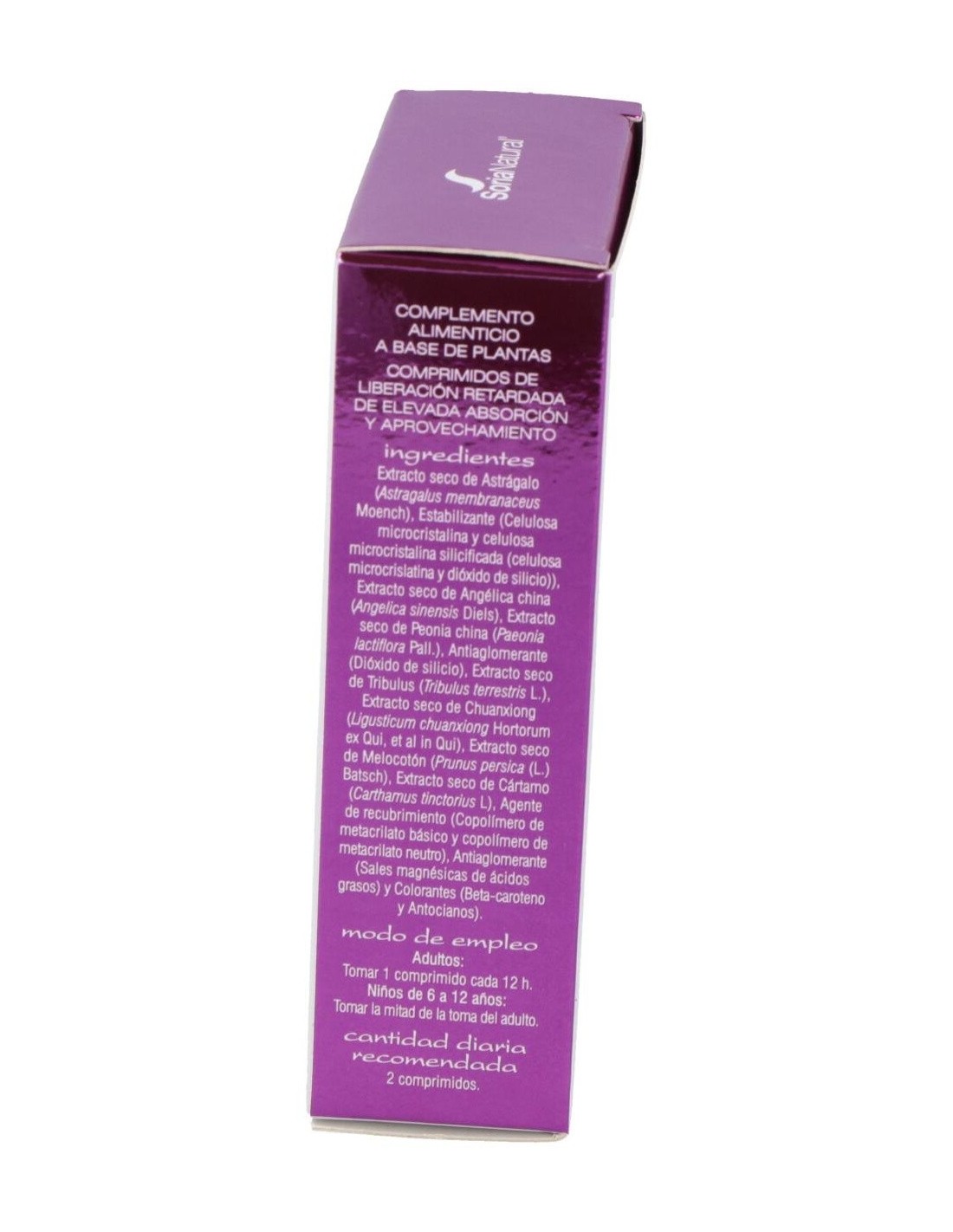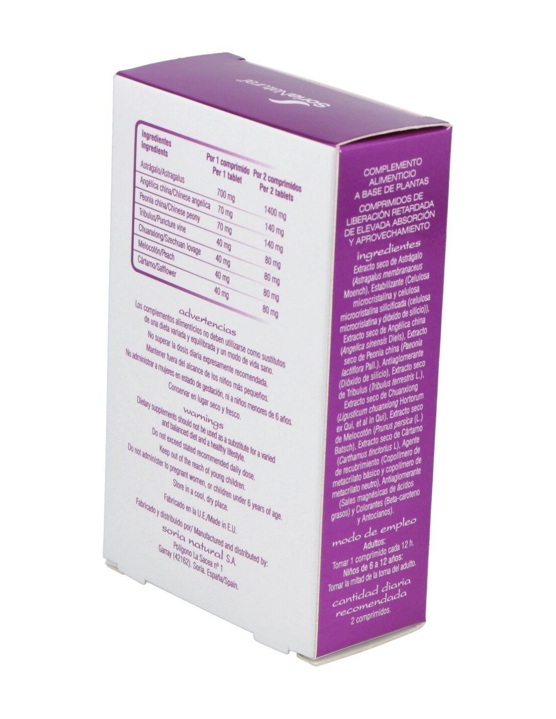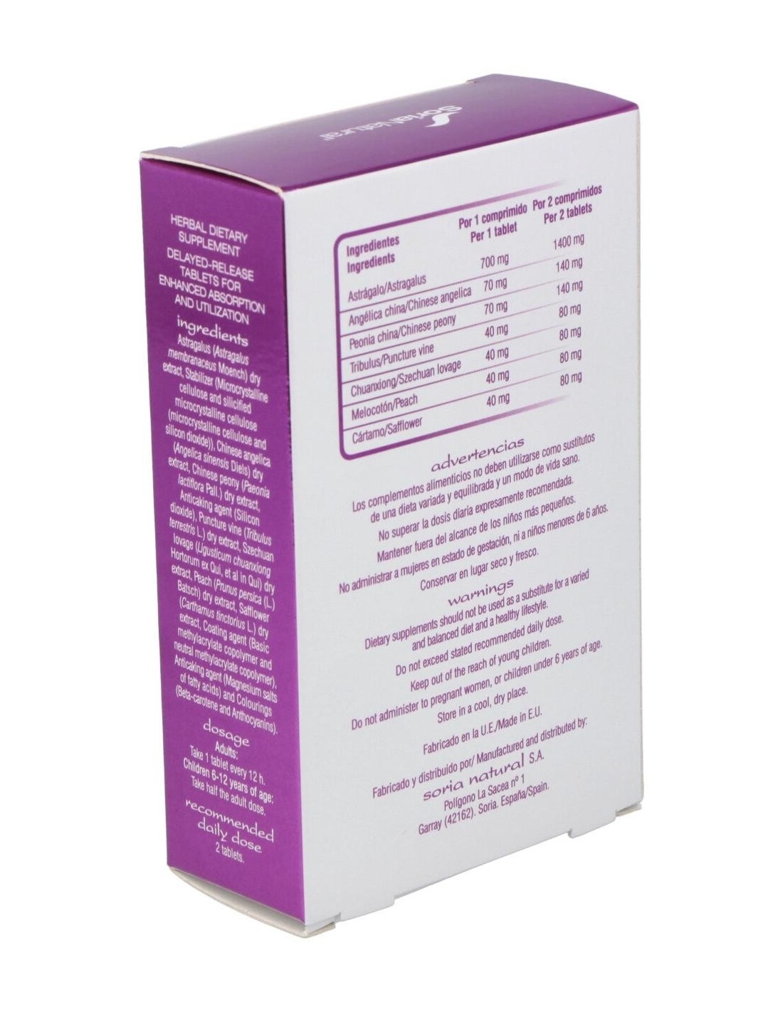 Extracto seco de Astrágalo (Astragalus membranaceus Moench), Estabilizante (Celulosa microcristalina), Extracto seco de Angélica china (Angelica sinensis Diels), Extracto seco de Peonia china (Paeonia lactiflora Pall.), Estabilizante (Hidroxipropilcelulosa), Extracto seco de Tribulus (Tribulus terrestris L.), Extracto seco de Chuanxiong (Ligusticum chuanxiong Hortorum ex Qui, et al in Qui), Extracto seco de Melocotón (Prunus persica (L.) Batsch), Extracto seco de Cártamo (Carthamus tinctorius L), Antiaglomerante (Dióxido de silicio), Agente de recubrimiento (Copolímero neutro), Antiaglomerante (Estearato de magnesio) y Colorantes (Beta-caroteno y Antocianos)