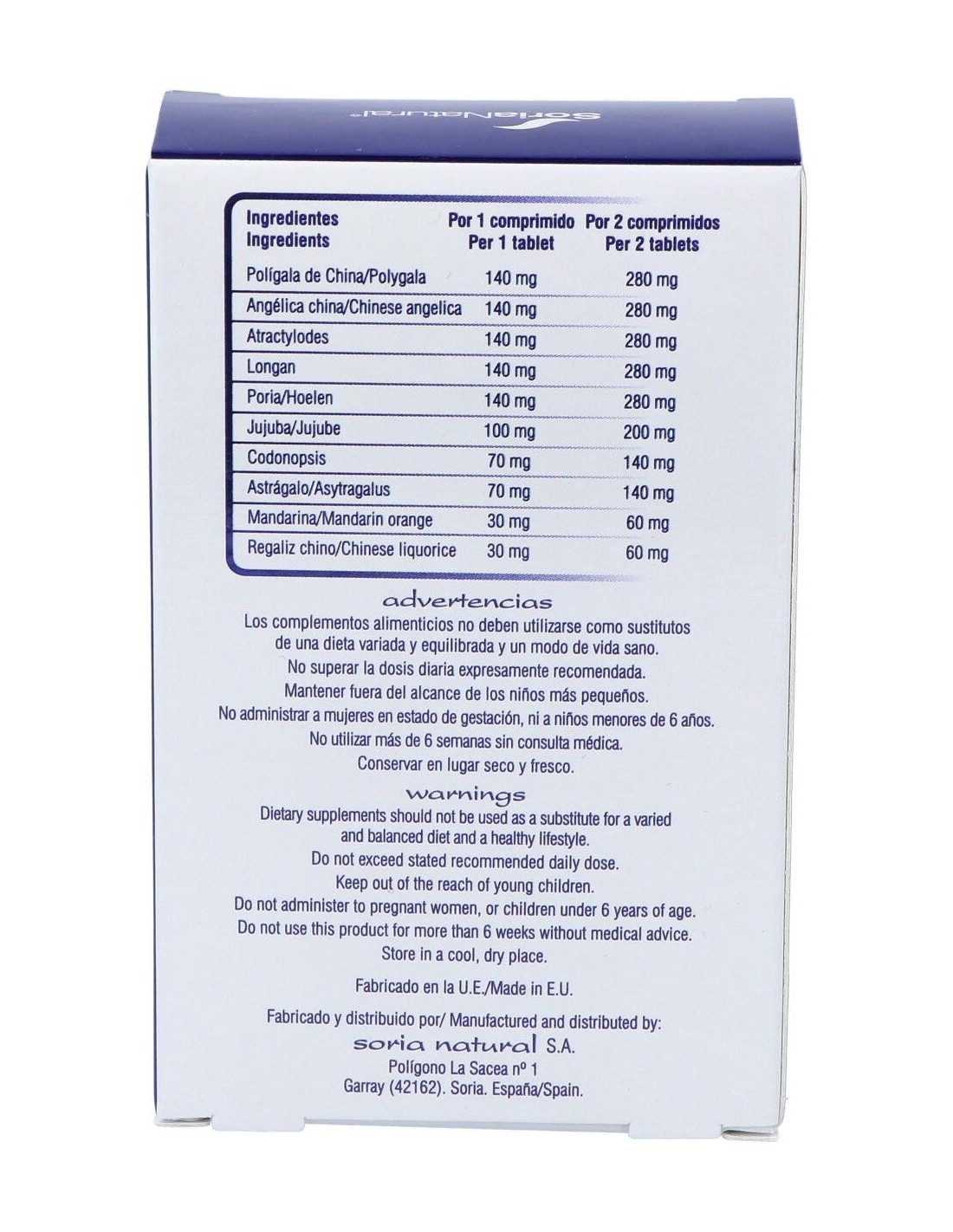 Estabilizante (Celulosa microcristalina), Extracto seco de Polígala de China (Polygala tenuifolia Willd.), Extracto seco de Angélica china (Angelica sinensis Diels), Extracto seco de Atractylodes (Atractylodes macrocephala Koidz.), Extracto seco de Longan (Euphorbia longan (Lour.) Steud.), Extracto seco de Poria (Poria cocos Wolf), Extracto seco de Jujuba (Ziziphus jujuba Mill.), Extracto seco de Codonopsis (Codonopsis pilosula (Franch.) Nannf.), Extracto seco de Astrágalo (Astragalus membranaceus Moench), Estabilizante (Hidroxipropilcelulosa), Antiaglomerante (Dióxido de silicio), Extracto seco de Mandarina (Citrus reticulata Blanco), Extracto seco de Regaliz chino (Glycyrrhiza uralensis Fischer ex De Candoll), Agente de recubrimiento (Copolímero neutro), Antiaglomerante (Estearato de magnesio) y Colorantes (Beta-caroteno y Antocianos).