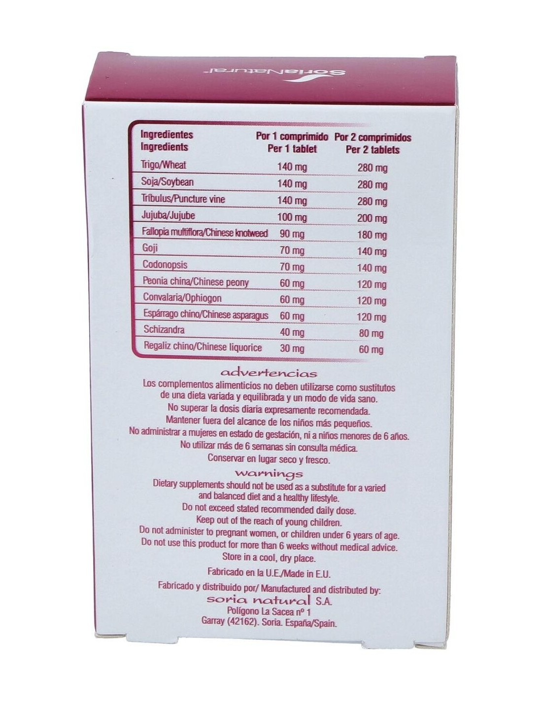 Estabilizante (Celulosa microcristalina), Extracto seco de Trigo (Triticum aestivum L.), Extracto seco de Soja (Glycine max (L.) Merrill), Extracto seco de Tribulus (Tribulus terrestris L.), Extracto seco de Jujuba (Ziziphus jujuba Mill.), Extracto seco de Fallopia multiflora (Polygonum multiflorum Thunb.), Extracto seco de Goji (Lycium barbarum L.), Extracto seco de Codonopsis (Codonopsis pilosula (Franch.) Nannf.), Estabilizante (Hidroxipropilcelulosa), Extracto seco de Peonia china (Paeonia lactiflora Pall.), Extracto seco de Convalaria (Ophiopogon japonicus (L.f.) Ker-Gawl.), Extracto seco de Espárrago chino (Asparagus cochinchinensis (Lour.) Merr.), Extracto seco de Schizandra (Schisandra chinensis (Kurcz.) Baill.), Antiaglomerante (Dióxido de silicio), Extracto seco de Regaliz chino (Glycyrrhiza uralensis Fischer ex De Candoll), Agente de recubrimiento (Copolímero neutro), Antiaglomerante (Estearato de magnesio) y Colorantes (Beta-caroteno y Antocianos).