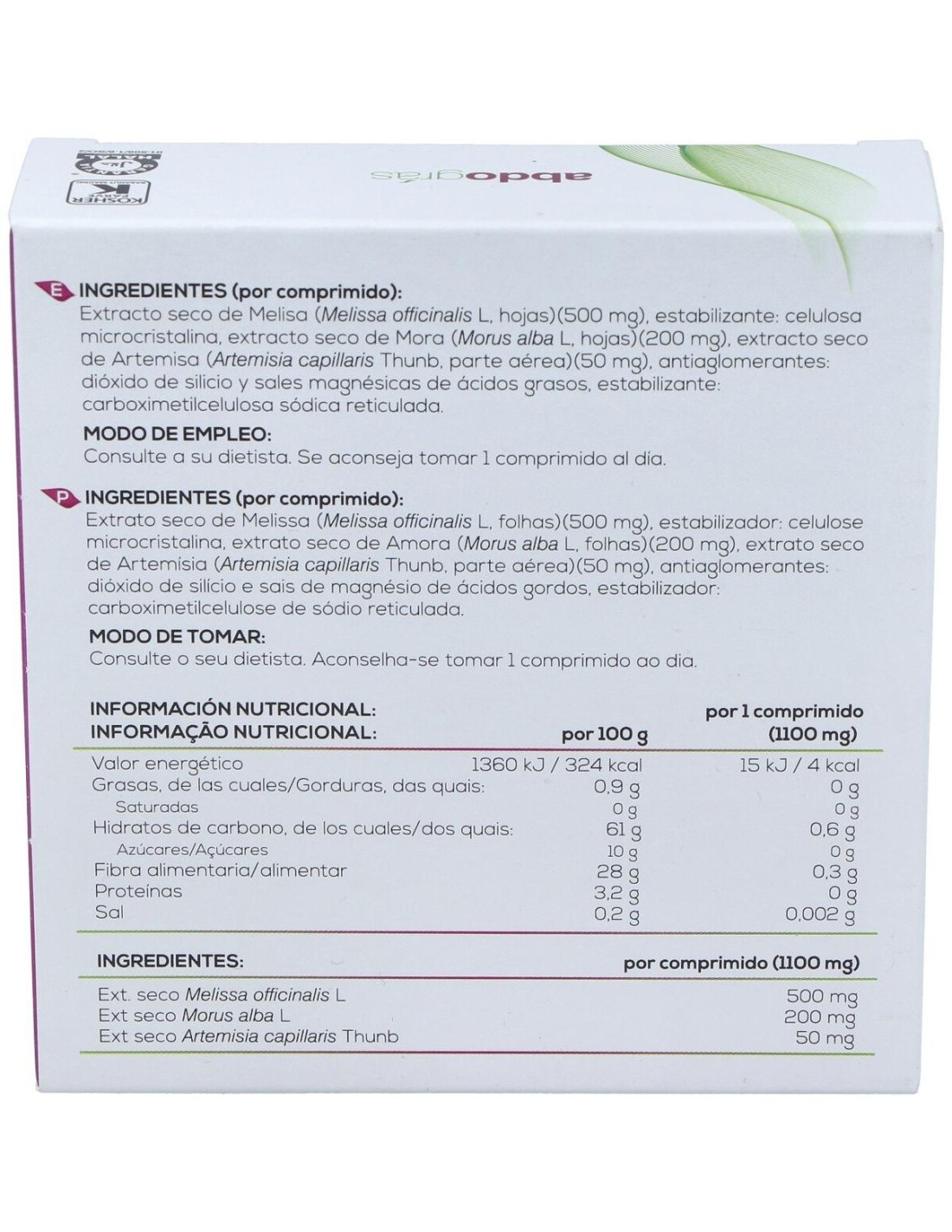 Extracto seco de Melisa (Melissa officinalis L., hojas) (500 mg), estabilizante: celulosa microcristalina, extractos seco de Mora (Morus alba L, hojas) (200 mg), extracto seco de Artemisa (Artemisia capillaris Thunb, parte aérea) (50 mg): estabilizante: carboximetilcelulosa sódica reticulada: antiaglomerante: sal magnésica de ácidos grasos.