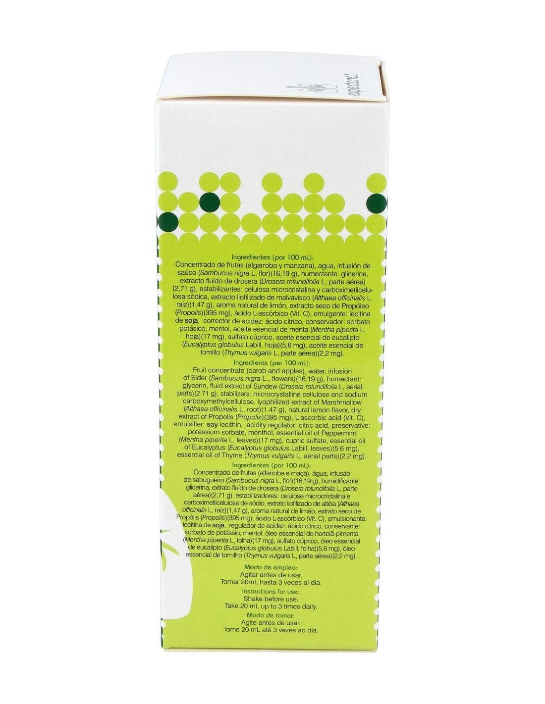 Infusión concentrada de saúco, malvavisco, drosera, eucalipto y tomillo, extracto de propóleo, concentrado de uva y manzana, estabilizador: glicerina vegetal y propilenglicol, aceite esencial de menta, aceite esencial de tomillo, mentol, aroma natural de limón, vitamina C, regulador de la acidez: ácido cítrico, sulfato de cobre, edulcorante: sucralosa, conservante: sorbato potásico.