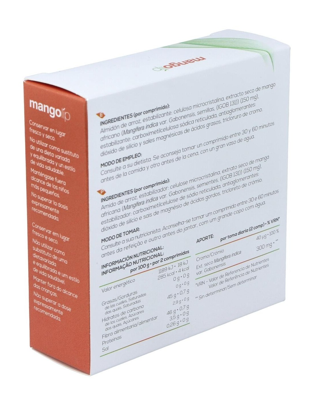 Almidón de arroz, estabilizante: celulosa microcristalina, extracto seco de semillas de mango africano (IGOB 131) (150 mg), estabilizante: carboximetilcelulosa sódica reticulada, antiaglomerantes: dióxido de silicio y sal magnésica de ác grasos, tricloruro de cromo.