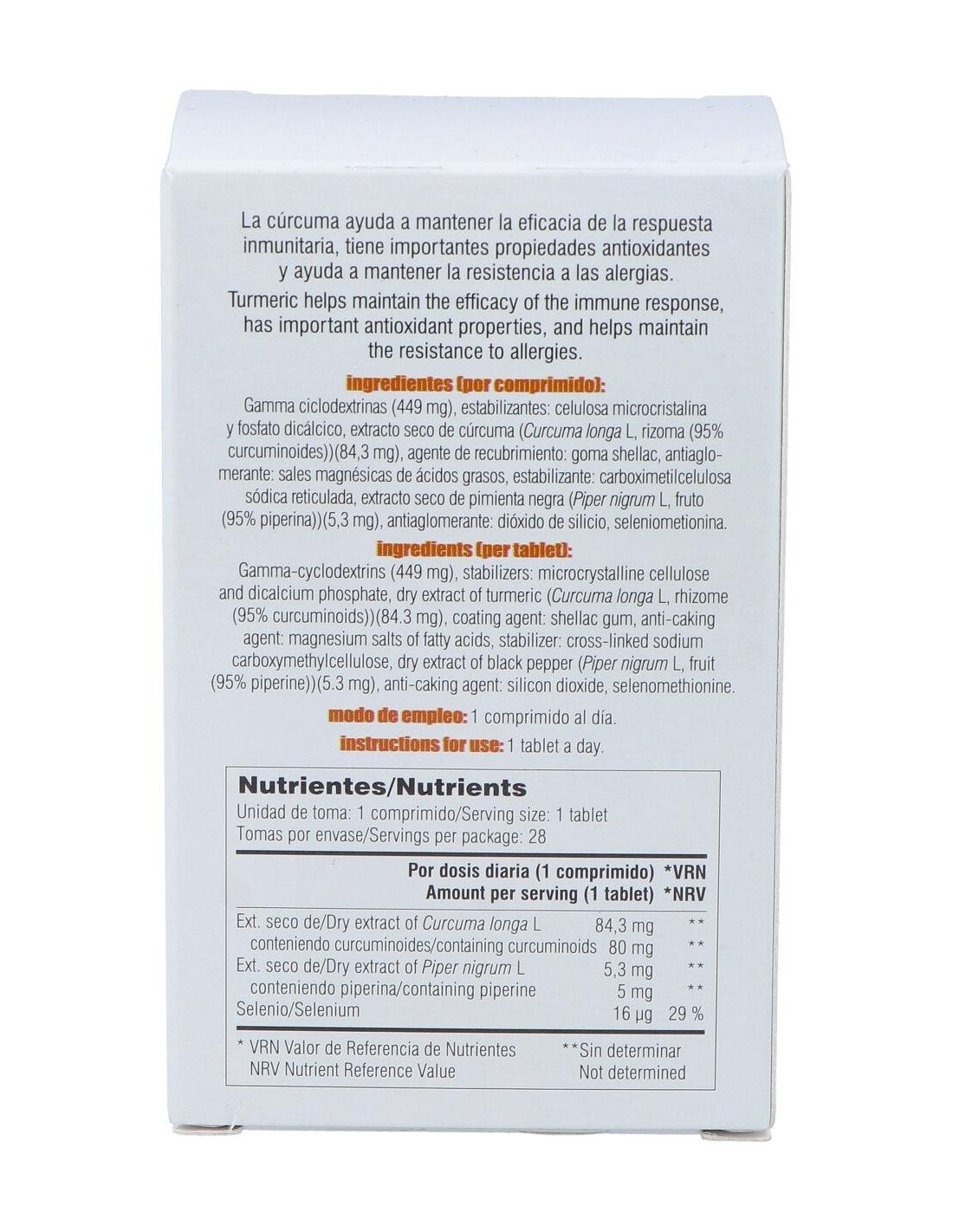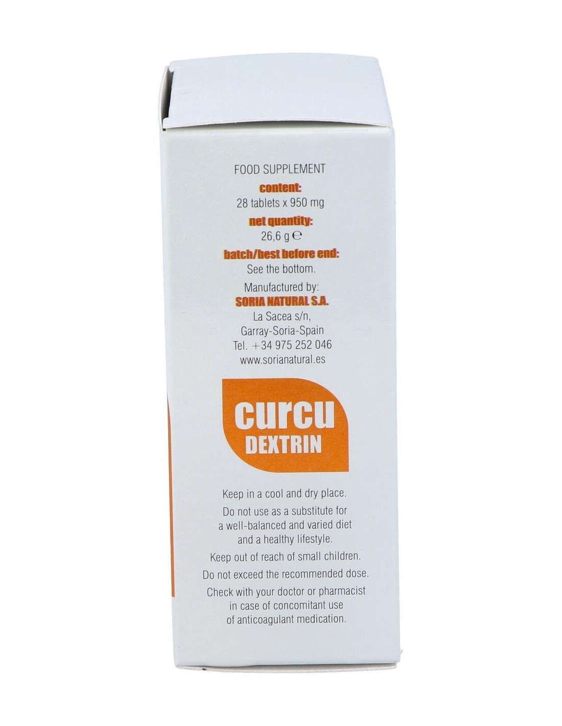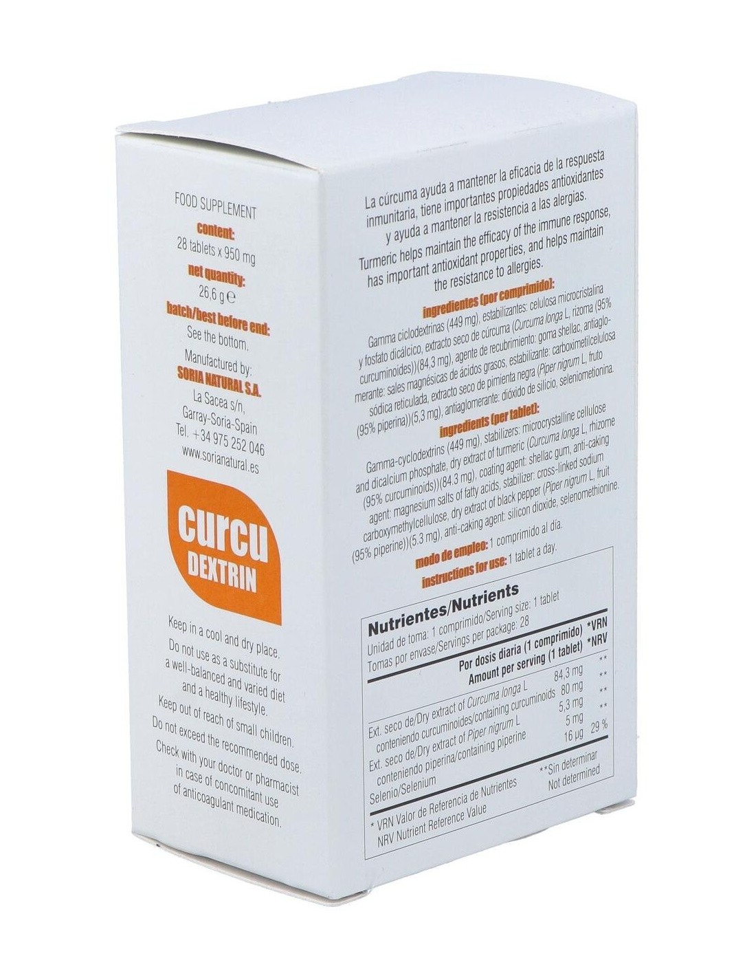 SORIA NATURALLa cúrcuma ayuda a mantener la eficacia de la respuesta inmunitaria, tiene importantes propiedades antioxidantes y ayuda a mantener la resistencia a las alergias. CURCUDEXTRIN 28comp.