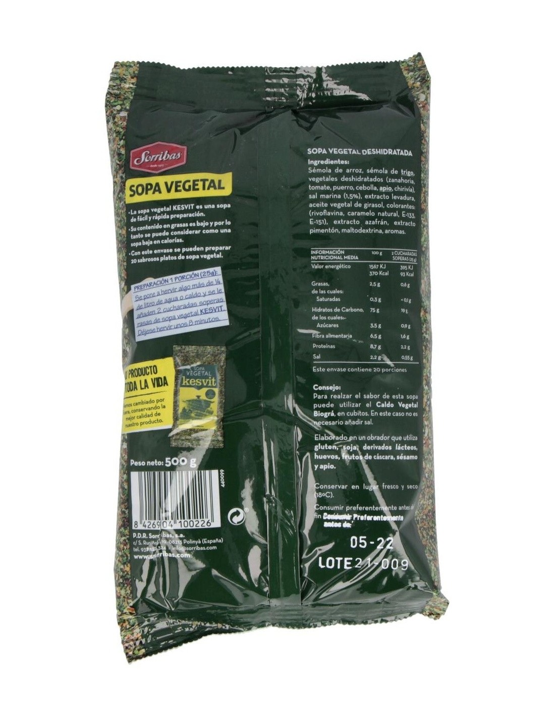 SORRIBASSopa vegetal sin glutamano añadido. Con bajo contenido en grasa y rico en fibra.
