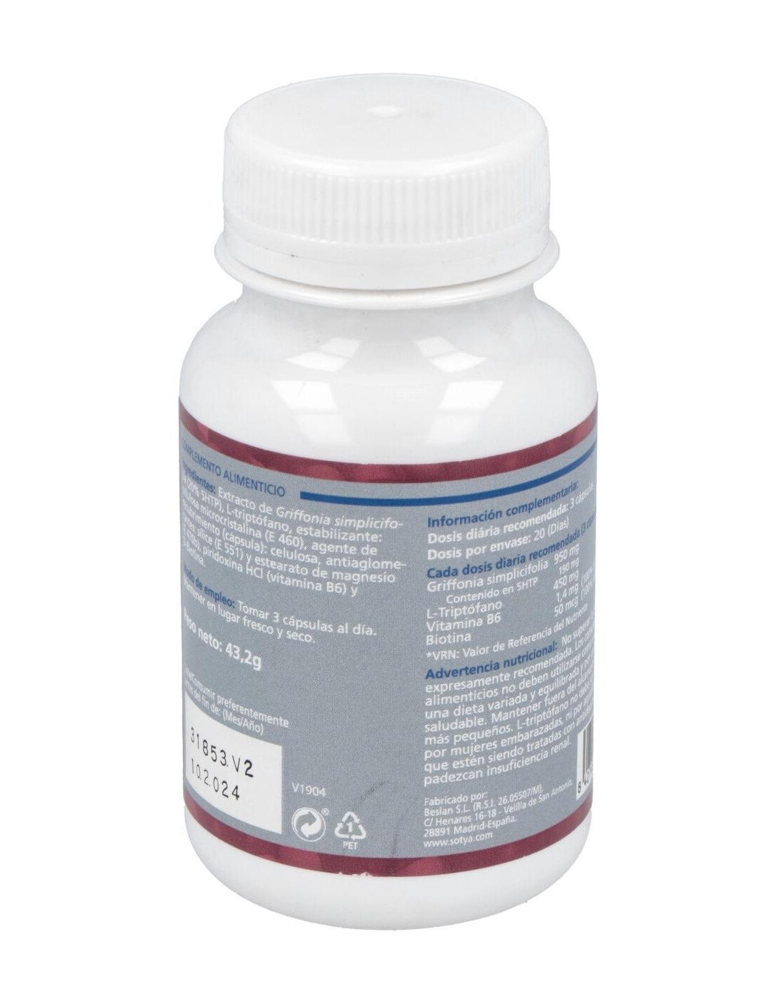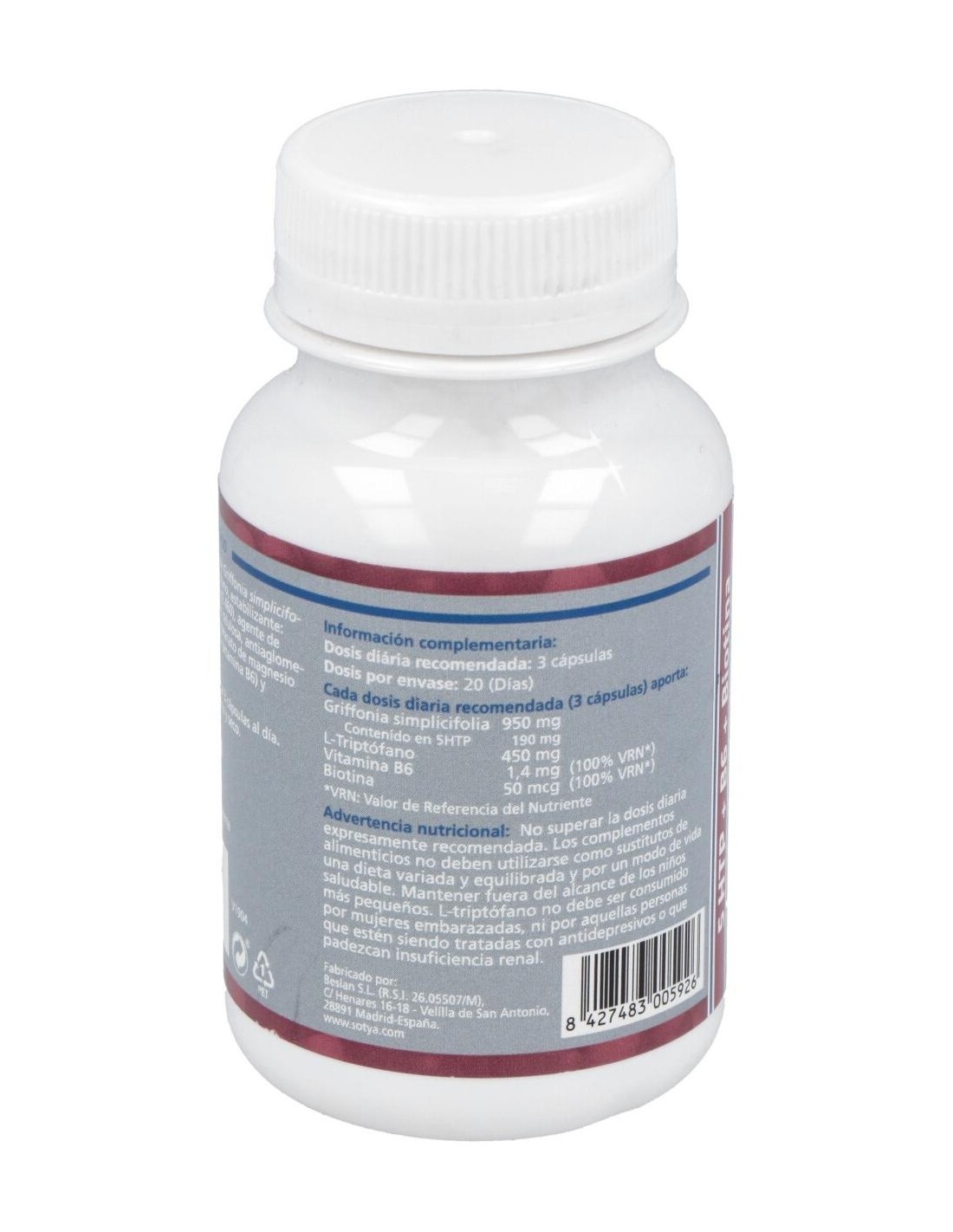 SOTYAEl 5Htp+B6+Biotina+Mg 650Mg 60 Cápsulas de Sotya es un suplemento nutricional para adultos que contribuye al bienestar emocional y la salud capilar mediante una fórmula combinada de 5-HTP, vitamina B6, biotina y magnesio.