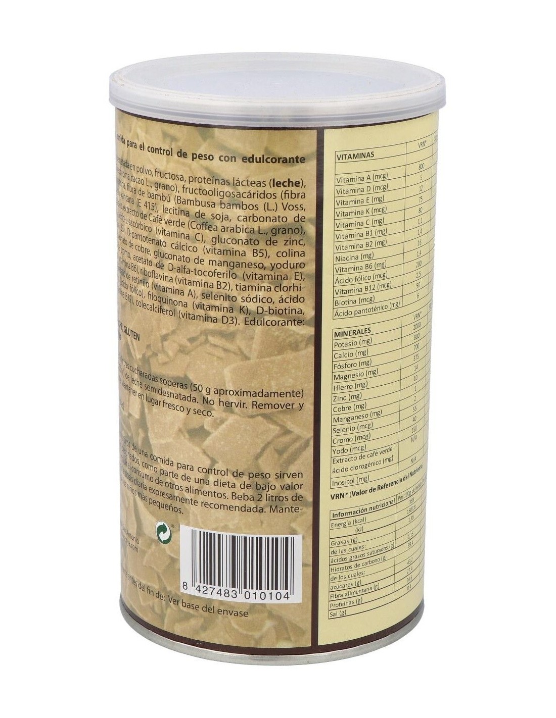Leche desnatada en polvo, fructosa, proteínas lácteas (leche), cacao desgrasado (Theobroma cacao L, grano), fructooligosacáridos (fibra de achicoria), maltodextrina, fibra de bambú (Bambusa manbos (L.) Voss, tallo), espesante: goma xantana (E415), lecitina de soja, carbonato de magnesio, citrato potásico, extracto café verde (Coffea arabica L., grano), gluconato de hierro, ácido L-ascórbico (vitamina C), gluconato de zinc, nicotinamida (vitamina B3), D-pantotenato cálcico (vitamina B5), colina bitartrato, inositol, gluconato de cobre, gluconato de manganeso, yoduro potásico, picolinato de cromo, acetato de D-alfa tocoferilo (vitamina E), piridoxina clorhidrato (vitamina B6), riboflavina (vitamina B2), tiamina clorhidrato (vitamina B1), acetato de retinilo (vitamina A), selenito sódico, ácido pteroilglutámico (ácido fólico), filoquinona (vitamina K), D-biotina, cianocobalamina (vitamina B12) y colecalciferol (vitamina D3). Edulcorante: sucralosa (E955).