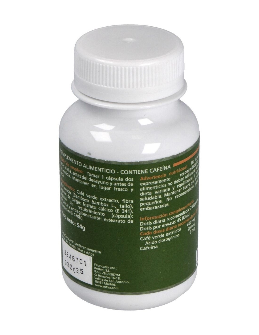 Cada cápsula contiene 200mg de extracto de café verde con 45% en ácido clorogénico. Cápsula vegetal de celulosa.