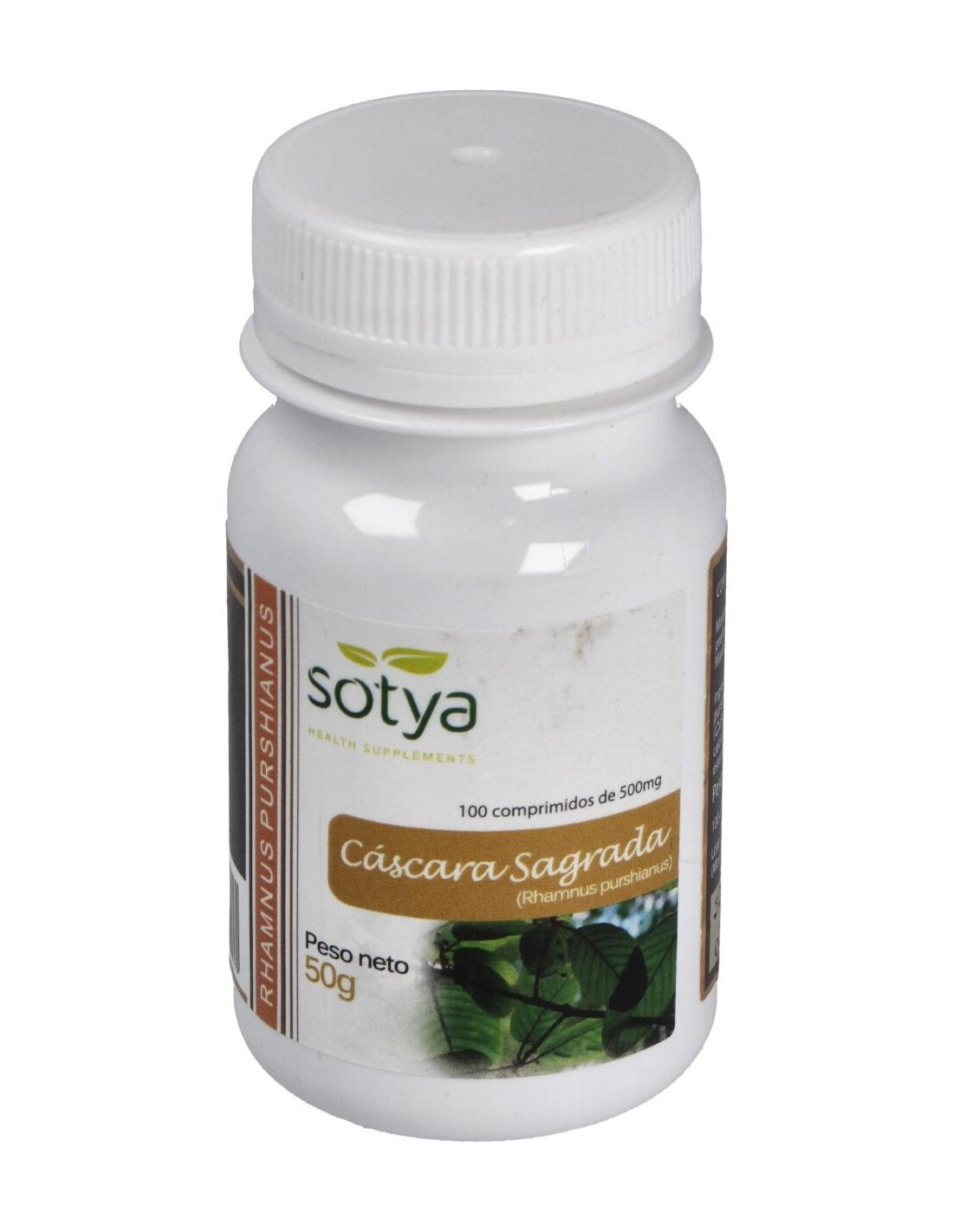 100 comprimidos de 500mg con 325mg de Cáscara Sagrada (Rhamnuspurshianus). Fosfato dicálcico, inulina y estearato de magnesio como excipientes.