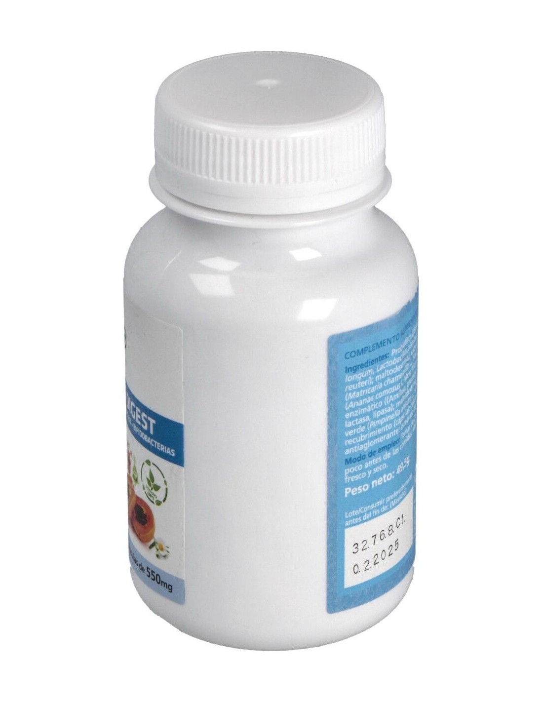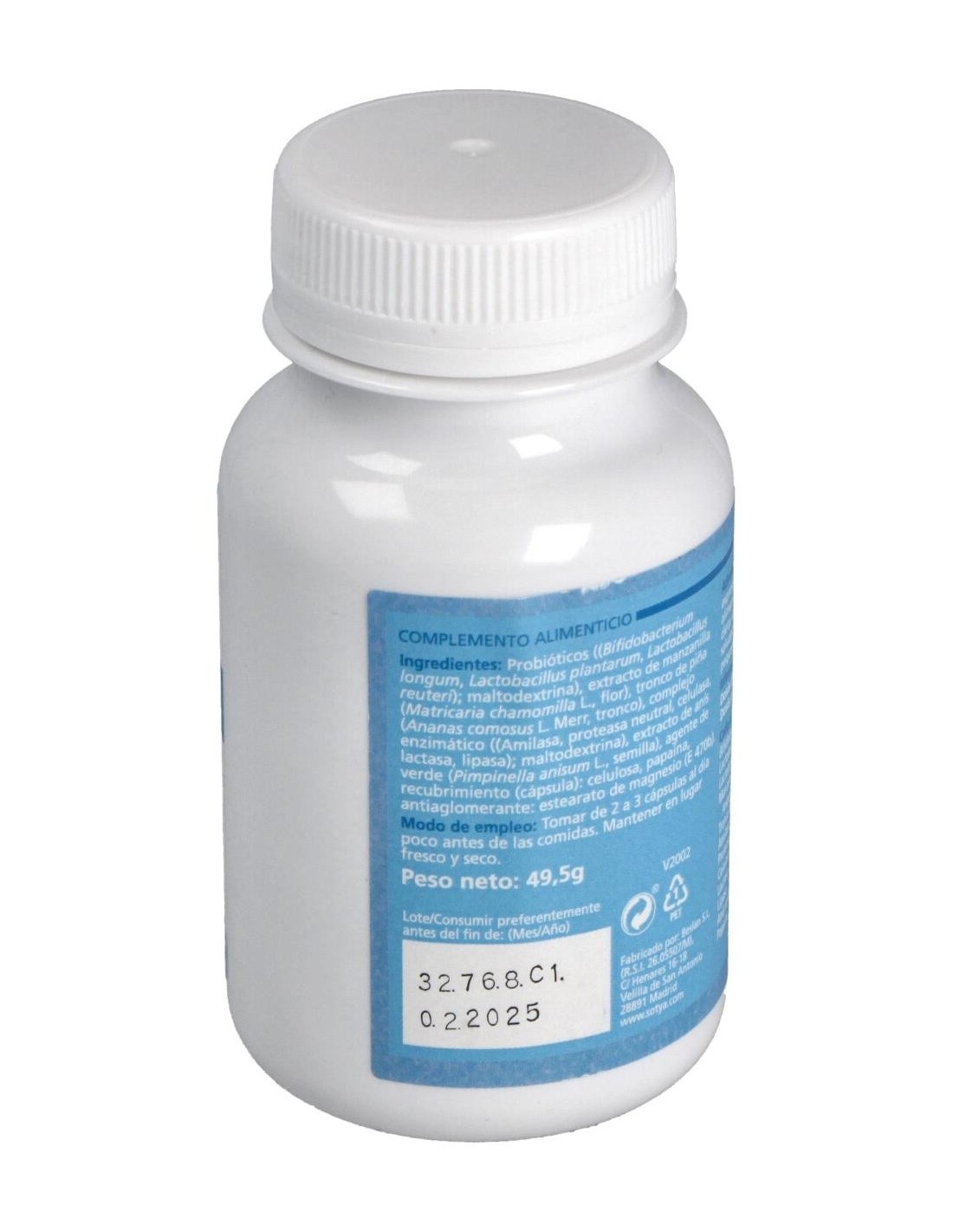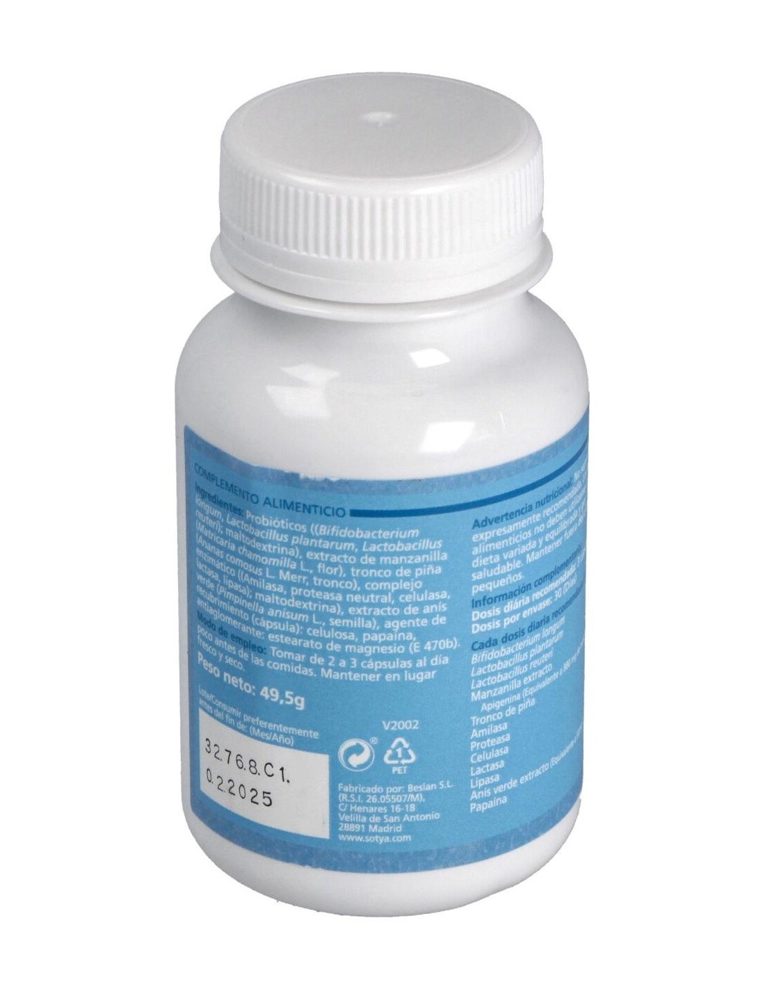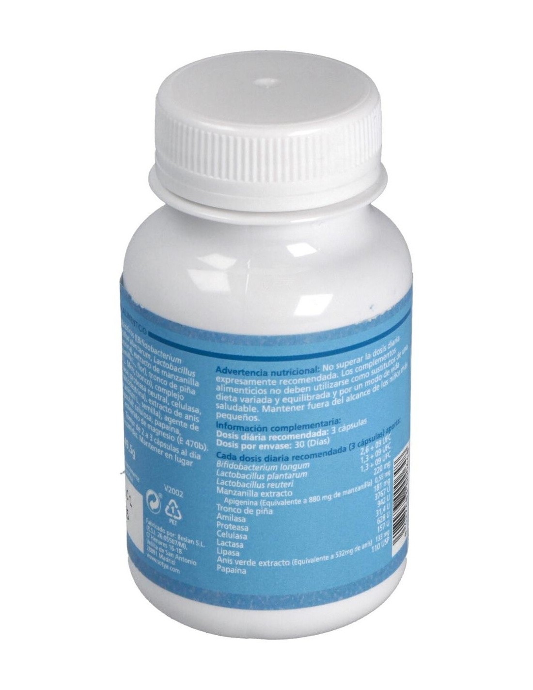 Bifidobacterias (lactobacillus acidophilus 25%, Lactobacillus casei 20%, Lactobacillus lactis 15%, Streptococcus termoñhilus 15%) 171mg; anís extracto 5:1 114mg (equivalente a 570mg); inulina (fructooligosacaridos) 71mg; yogur en polvo 57mg; manzanilla extracto 5:1 57mg; tronco de piña (bromelaína) 45mg; papaína 28mg; aloe vera extracto 200:1 22mg (equivalente a 4540mg); enzimas digestivas (amilasa, fosfatasas, ribonuclesasas, grasa hidrolasa, tirsinasa, catalasa, 5-AMP deaminasa) 5,5mg.