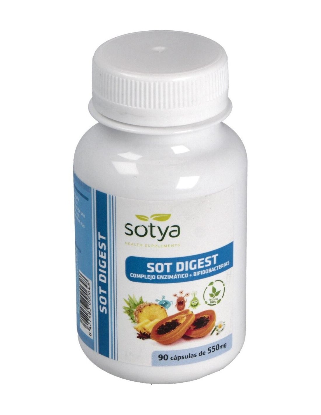 Sotya Sot Digest 550mg es un complemento alimenticio que engloba un conjunto de ingredientes que te ayudarán a facilitar la digestión y absorber mejor los nutrientes: enzimas digestivas, papaya y piña, bifidobacterias.