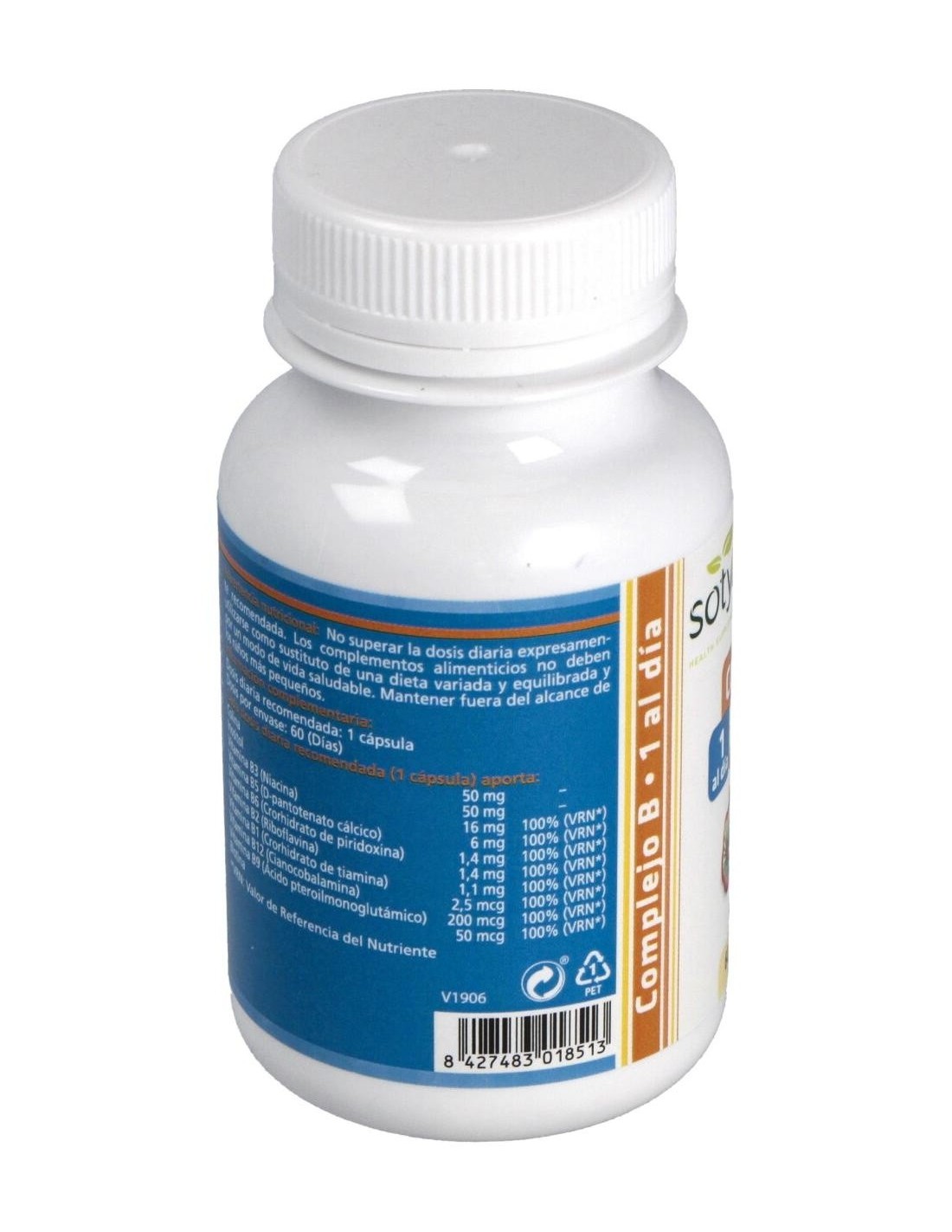 Cada cápsula contiene levadura de cerveza (370mg), colina (50mg), inositol (50mg), vitamina B3 (18mg), vitamina B5 (6mg), vitamina B6 (2mg), vitamina B2 (1.6mg), vitamina B1 (1.4mg), vitamina B9 (0.2mg), vitamina B12 (0.001mg), biotina (0.00015mg). Una cápsula aporta el 100% de la CDR de todas las vitaminas del complejo B.