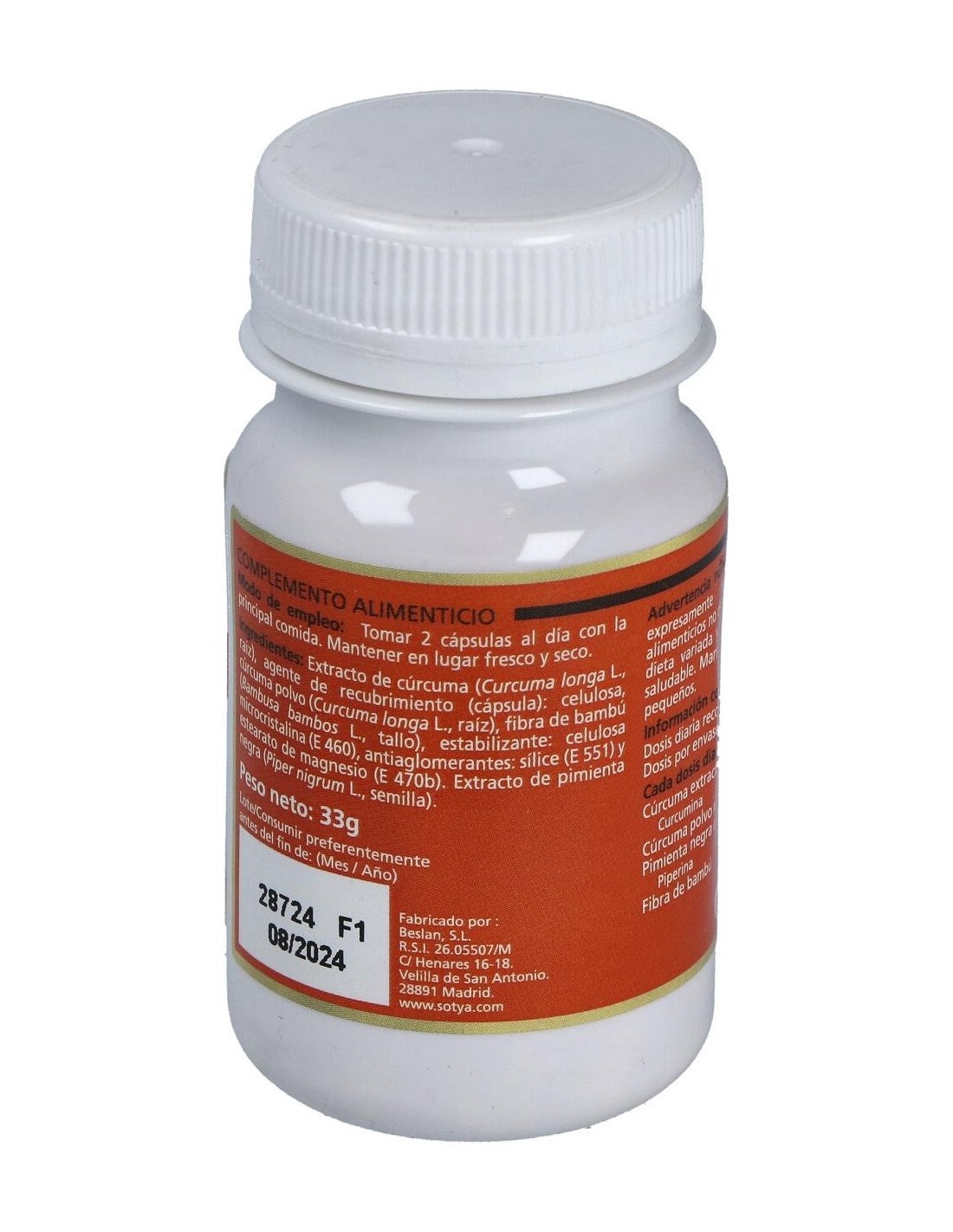 SOTYA"DescripciónSotya Curcumin Plus 60 cápsulas es un complemento alimenticio natural formulado a base de curcumina, un componente procedente de la cúrcuma, que cuenta con propiedades estomacales, carminativas y colagogas, que estimulan la producción de jugos gástricos, biliares y pancreáticos, ayudando así a mejorar la digestión, al mismo tiempo que disminuye las flatulencias.Cuenta con un potente efecto antiinflamatorio, que puede ayudar a reducir la inflamación causada por dolencias articulare.