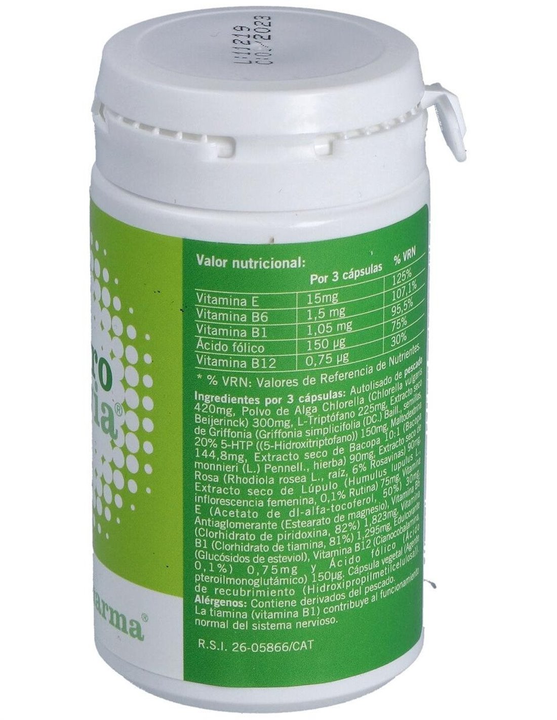 Autolisado de pescado (Garumar), L-triptófano, Griffonia simplicifolia, lúpulo, chlorella, levadura de litio, vitaminas B1, B6, B9, B12 y E.