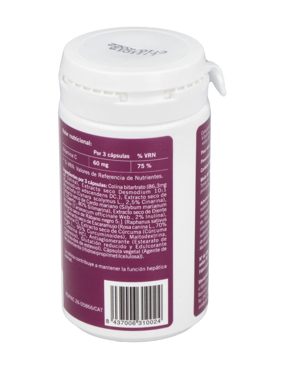 Extractos secos de desmodium, cardo mariano, alcachofera, rábano negro, diente de león, cúrcuma. Fruto de escaramujo, L-cisteína y L-glutatión, estearato de magnesio, maltodextrina, hidroxipropilmetilcelulosa.