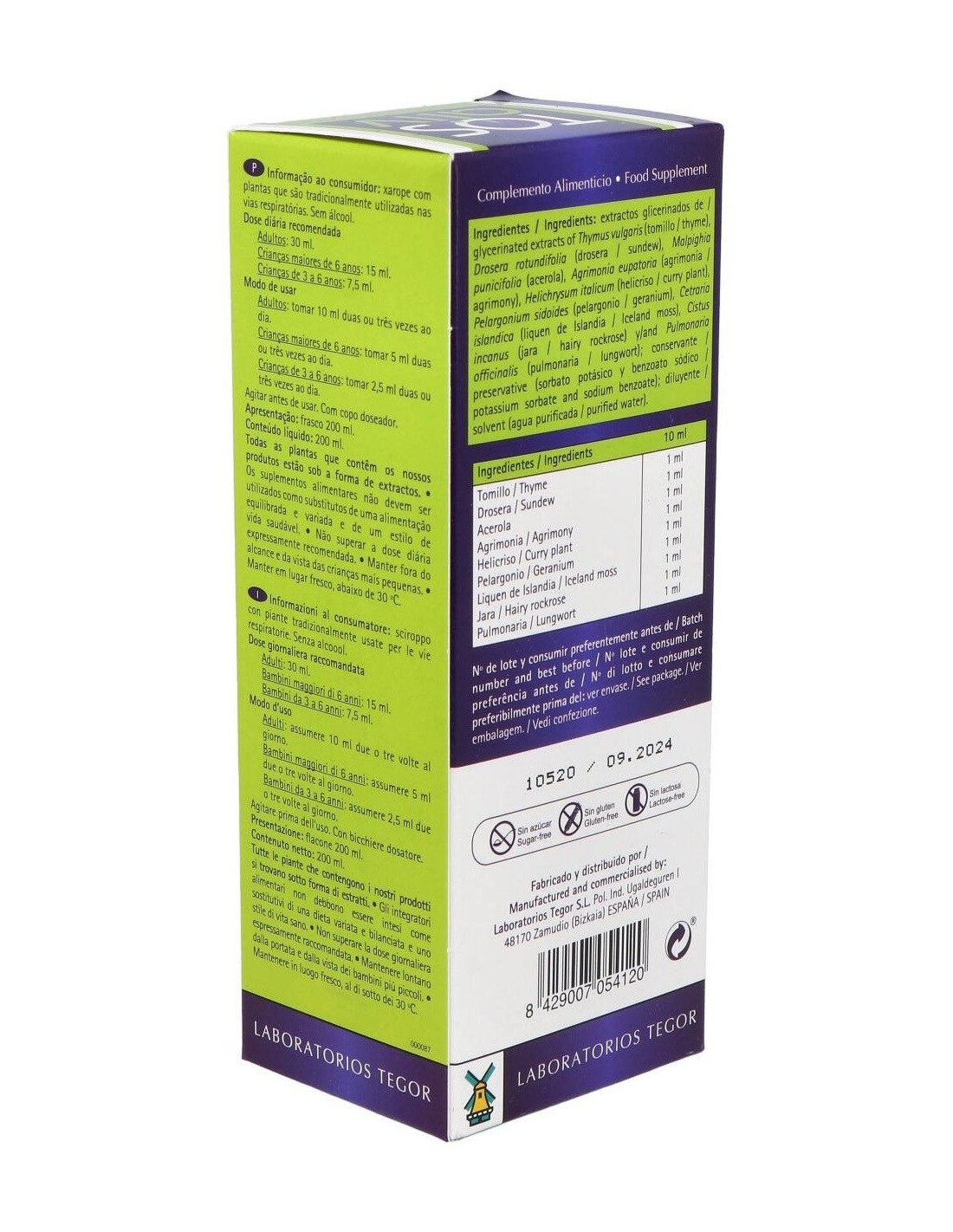 Complemento alimenticio formulado a base de extractos glicerinados de tomillo, acerola, helicriso y 6 plantas adicionales. Presentación en jarabe de 200ml. Ayuda a mantener las vías respiratorias en condiciones normales. A sus ingredientes se les atribuyen propiedades descongestivas y expectorantes. Indicado para adultos y niños.