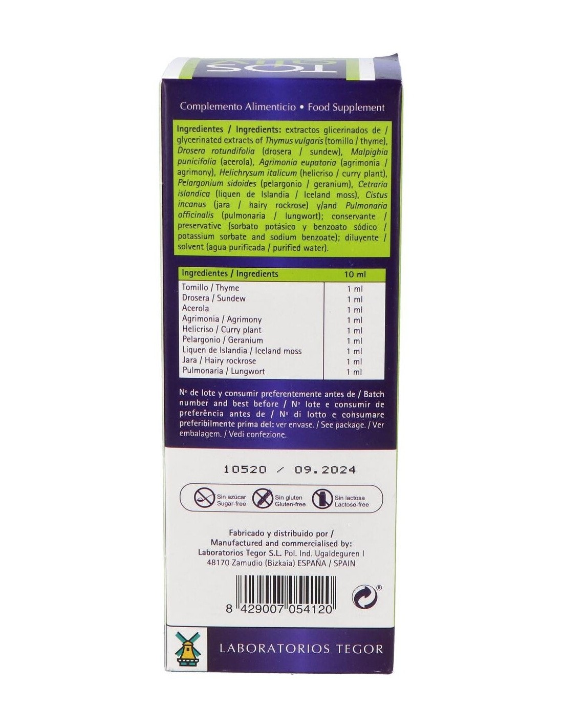Exto. glicerinado de Tomillo (Thymus vulgaris), Exto. glicerinado de Drosera (Drosera rotundifolia), Exto. glicerinado de Acerola (Malpighia punicifolia), Exto. glicerinado de Agrimonia (Agrimonia eupatoria), Exto. glicerinado de Helicriso (Helychrisum italicum), Exto. glicerinado de Pelargonio (Pelargonium sidoides DC), Exto. glicerinado de Liquen de Islandia (Cetraria islandica L.), Exto. glicerinado de Jara (Cistus incanus L.), Exto. glicerinado de Pulmonaria (Pulmonaria officinalis L.), Aditivos, c.s.p.