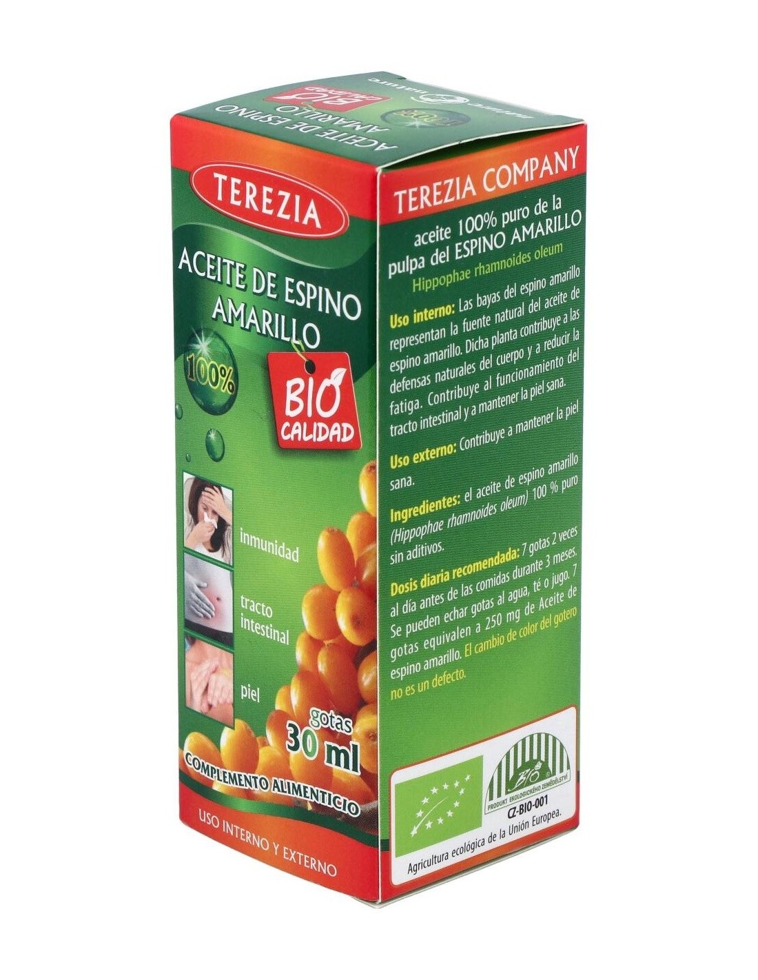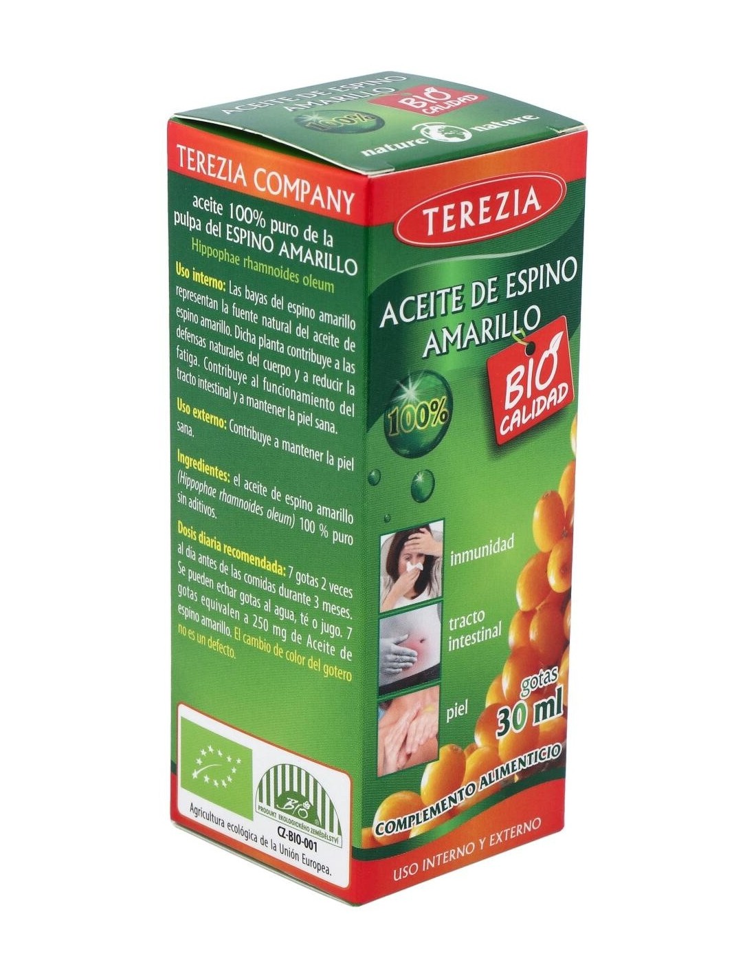 TEREZIAEl aceite de espino amarillo contribuye al normal funcionamiento del sistema inmune, a reducir la fatiga, al funcionamiento normal del tracto intestinal, y a mantener la piel y mucosas en condiciones normales. El aceite de espino amarillo contribuye al normal funcionamiento del sistema inmune, a reducir la fatiga, al funcionamiento normal del tracto intestinal, y a mantener la piel y mucosas en condiciones normales.