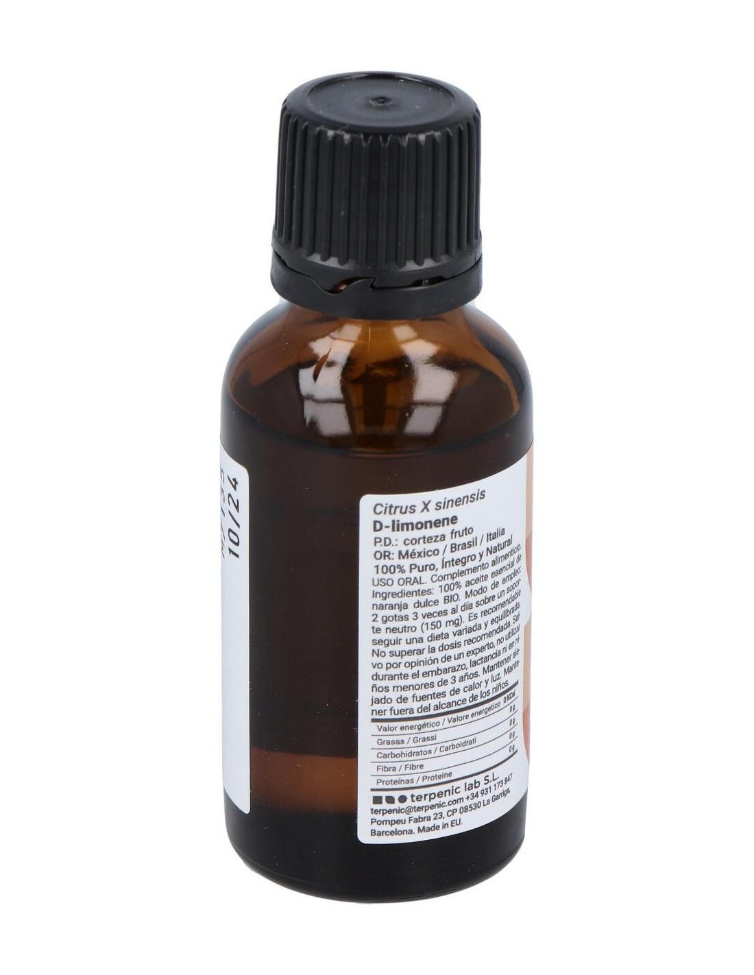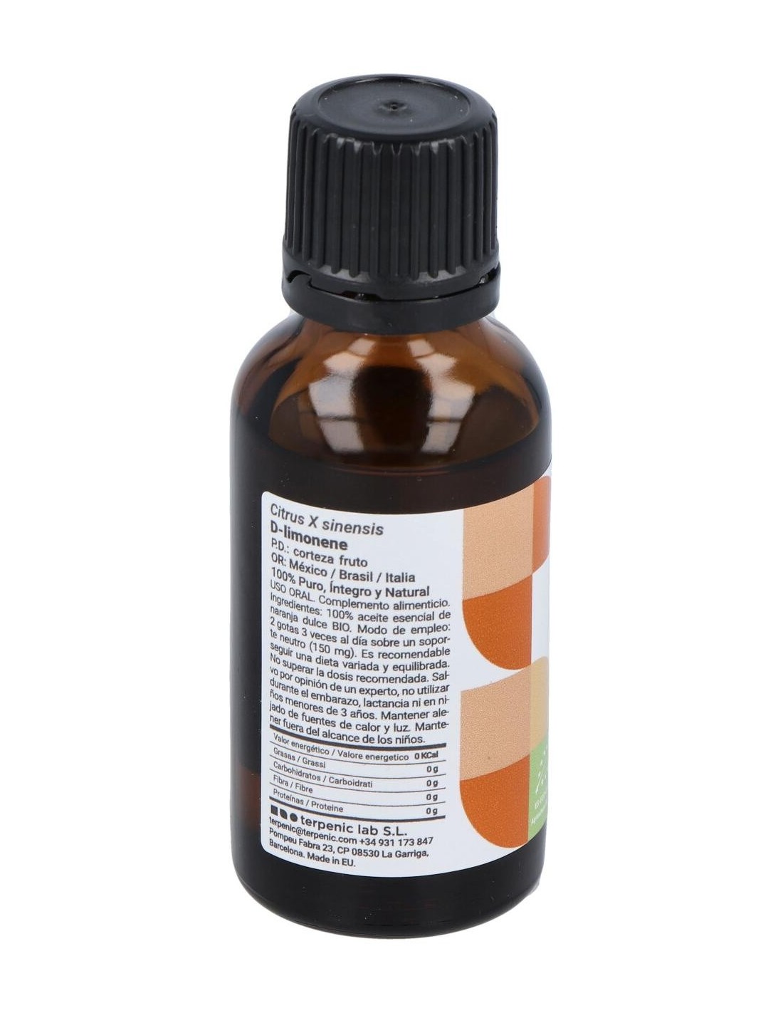 La compañía Terpenic ha desarrollado un aceite esencial de naranja dulce. Este producto cuenta con propiedades antisépticas y puede utilizarse de formas diversas. Por ejemplo, sirve para desinfectar el ambiente. Su ingesta también ofrece ventajas, ya que puede aliviar trastornos digestivos, sobre todo los causados por el nerviosismo. Los ingredientes de este aceite son de origen orgánico y su cultivo es amigable con sus consumidores y el medioambiente. Por este motivo, cuenta con el sello de certificación ecológica de la Unión Europea. Es necesario tener la precaución de no exponerse directamente a los rayos solares después de su aplicación tópica, pues es fotosensibilizador. Se recomienda, adicionalmente, conservar el producto en un lugar fresco, seco y manteniéndolo fuera del alcance de los niños. Puede ser usado por personas de todas las edades. No abusar de su uso.