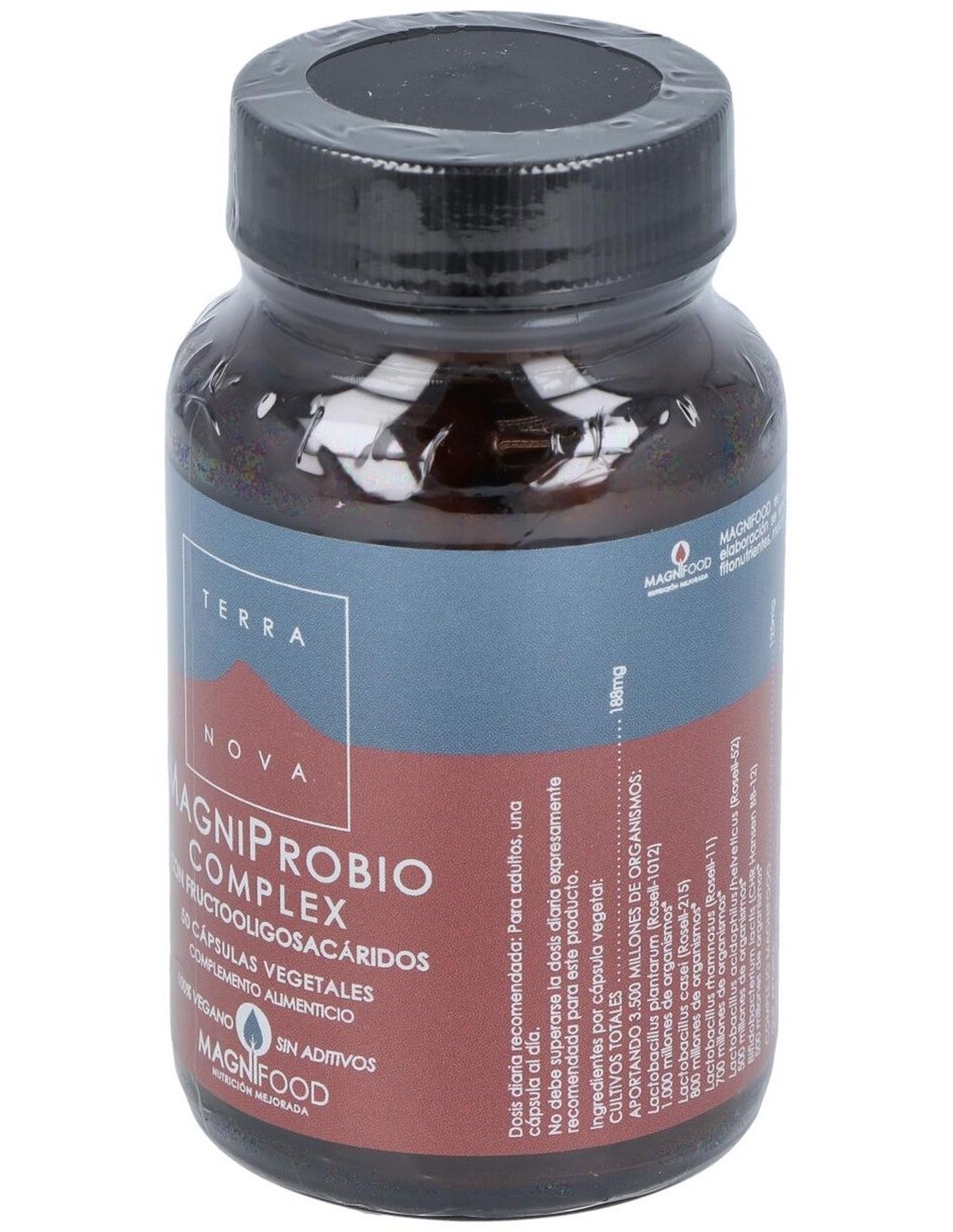 Complemento alimenticio a base de cultivos de lactobacilos y bifidobacterias, plantas del Complejo Magnifood y fructo-oligosacáridos. Apto para vegetarianos y veganos.
