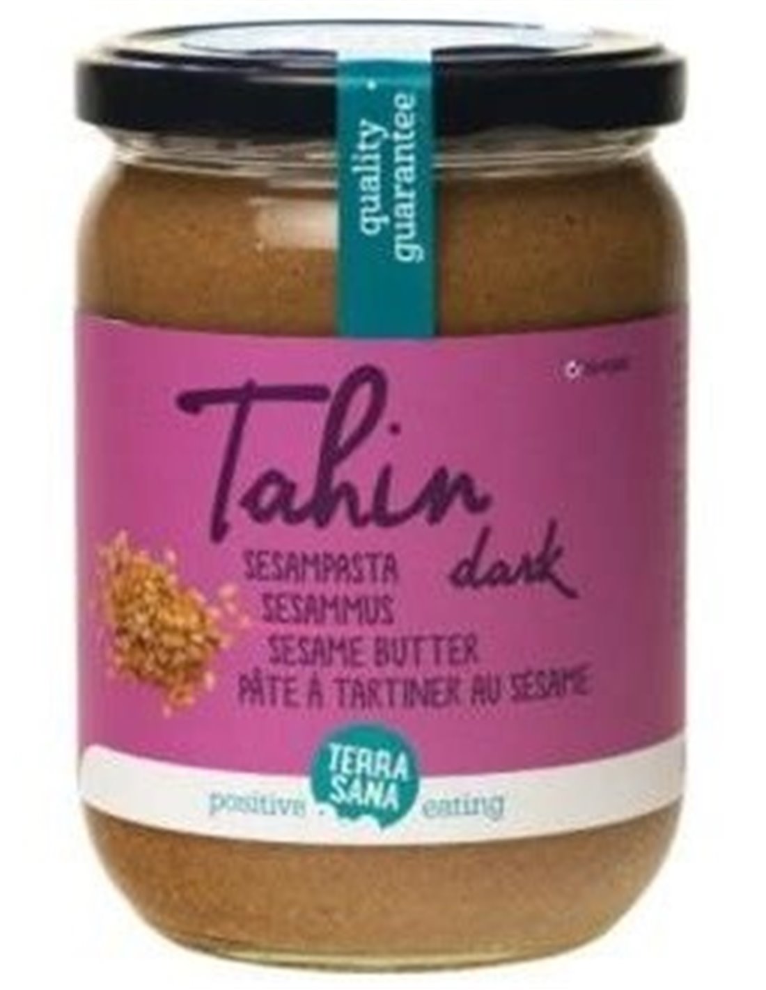 TERRASANAEl tahini oscuro es una deliciosa pasta de sésamo elaborada de forma sostenible que se compone 100 % de semillas de sésamo (sin cáscara). El sabor rico y ligeramente salado funciona tanto en platos dulces como salados.