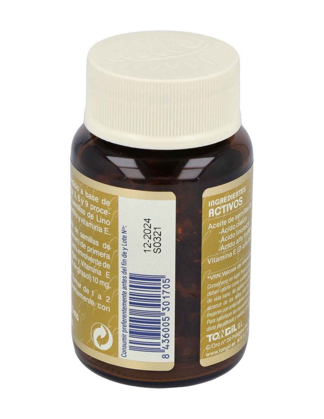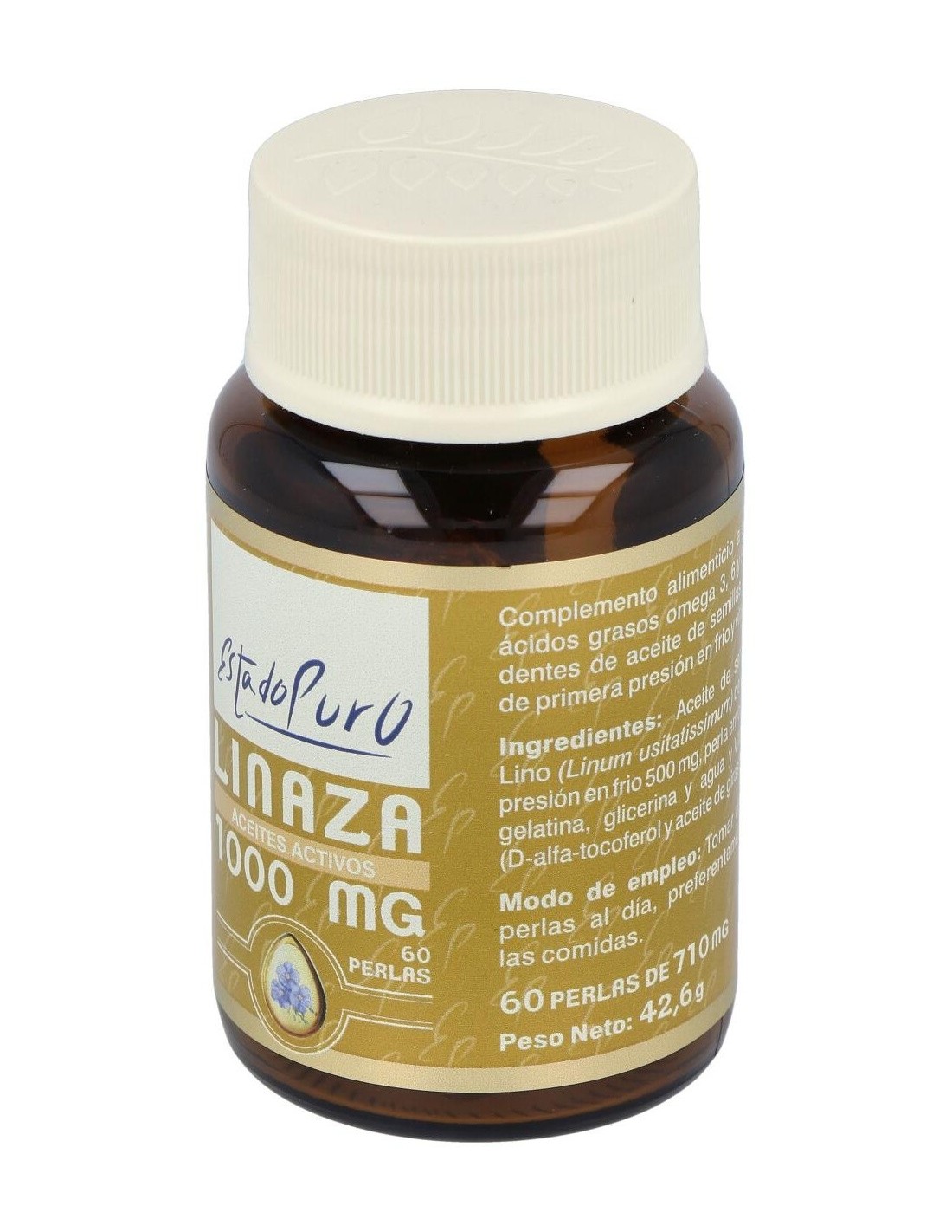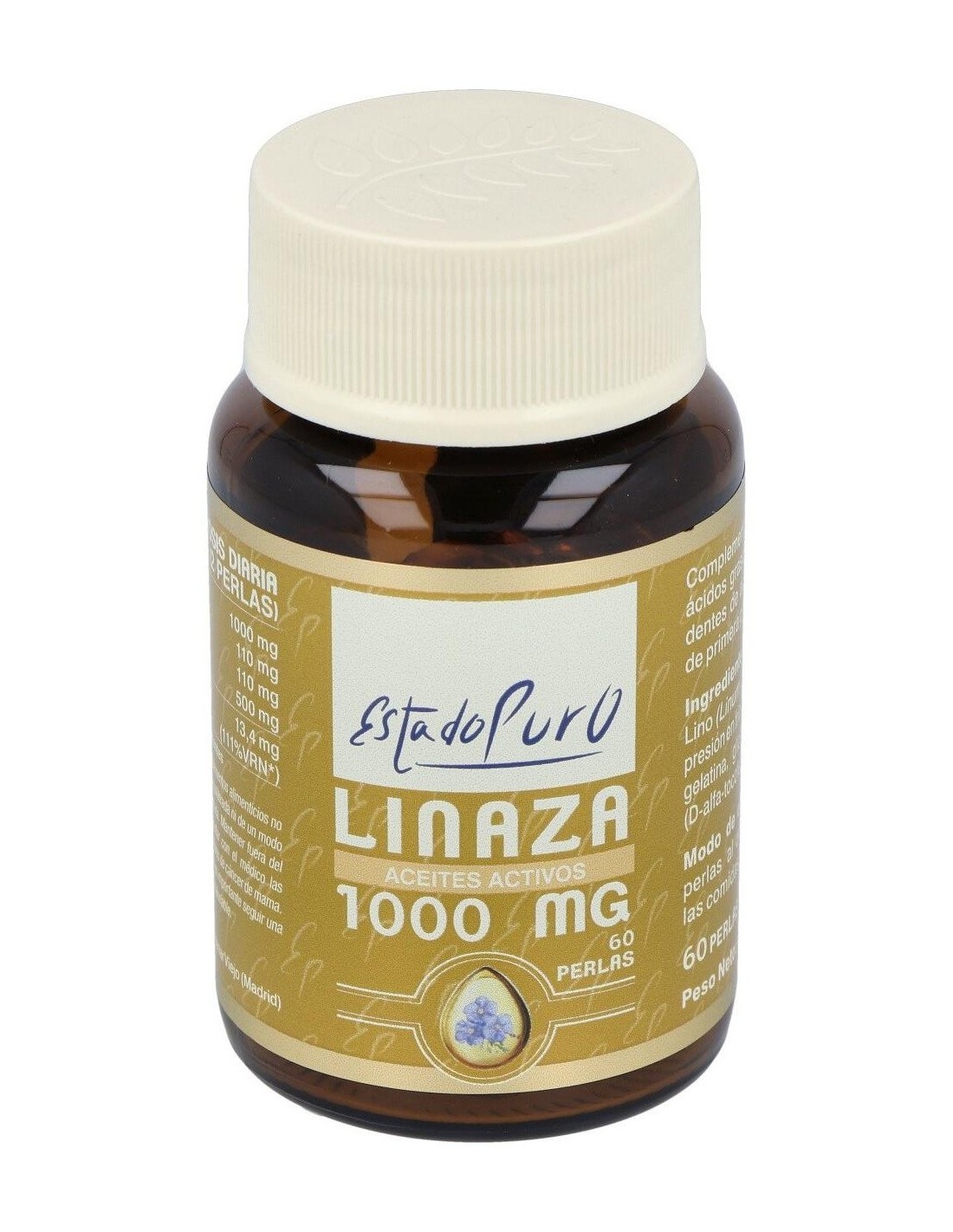 Aceite de semillas de Lino (Linum usitatissimum) de primera presión en frío 500 mg, perla envolvente de gelatina, glicerina y agua y Vitamina E (D-alfa- tocoferol y aceite de girasol) 10 mg.
