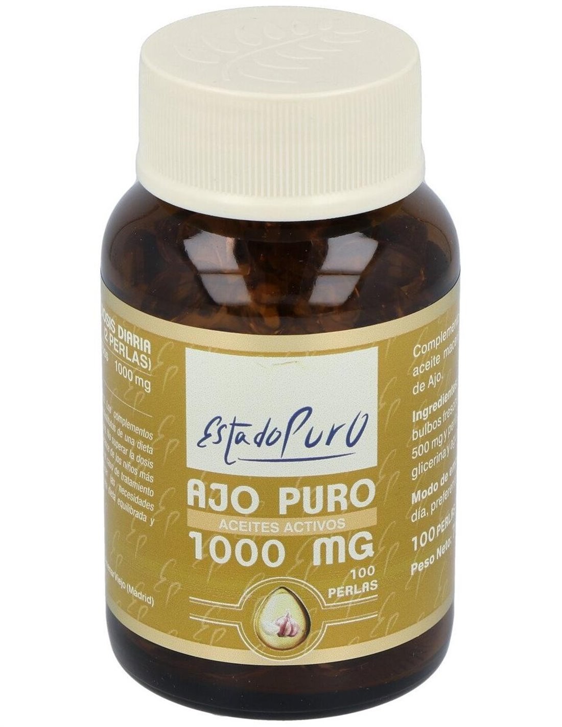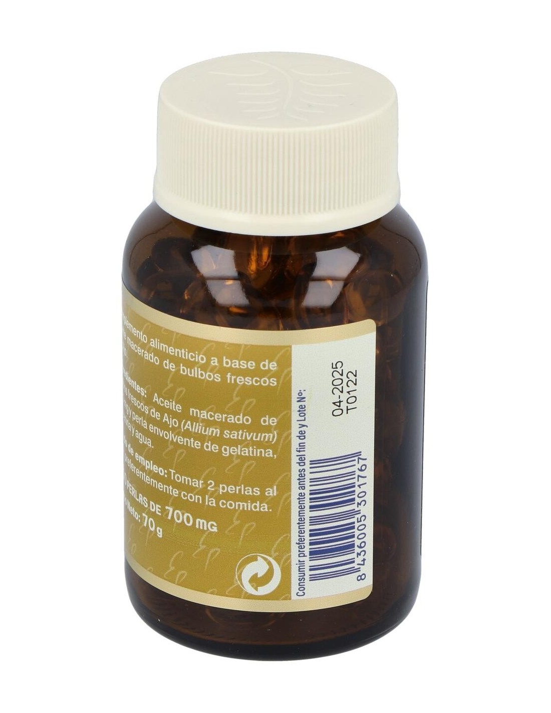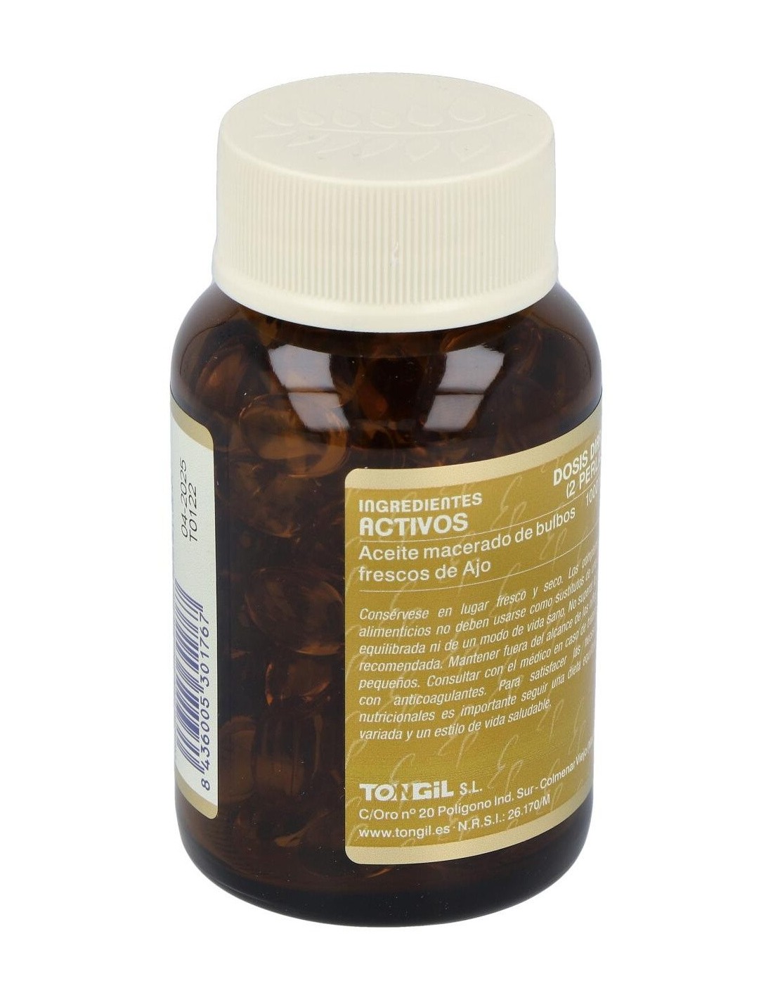 Aceite macerado de bulbos frescos de Ajo (Allium sativum) 500 mg y perla envolvente de gelatina, glicerina y agua.