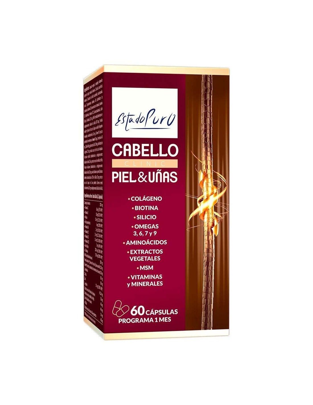 Por 1 cápsula:\ Cápsula vegetal, complejo vitamínico (agente de carga: manitol, vitamina C (ácido L-ascórbico), vitamina E (acetato de dl-alfa tocoferilo), nicotinamida, calcio D-pantotenato, vitamina B6 (clorhidrato de piridoxina), vitaminaB1(mononitratodetiamina),vitaminaB2(riboflavina), vitamina B12 (cianocobalamina), ácido fólico y D-biotina) 100 mg, MSM (metilsulfonilmetano y antiaglomenrate: dióxido de silicio) 100 mg, Puredia seaBerry® (polvo del fruto de Espino amarillo Hippophae rhamnoides , maltodextrina) 60 mg, Ovomet® (extracto patentado de membrana de huevo) 50 mg, L-metionina 40 mg, Cistina 40 mg, gluconato de Zinc 39 mg, clorhidrato de L-arginina 25 mg, extracto seco del fruto de Arándano Vaccinium myrtillus (maltodextrina y antiaglomerante: dióxido de silicio) 25 mg, extracto seco de semillas de Mijo Panicum miliaceum (maltodextrina y antiaglomerante: dióxido de silicio) 20 mg, savia de Bambú en polvo (Bambusa bambos) estandarizado al 35% en Silicio 20 mg, extracto seco de bayas de Saw palmetto ( Serenoa repens) (maltodextrina) 20 mg y antiaglomerante (dióxido de silicio).