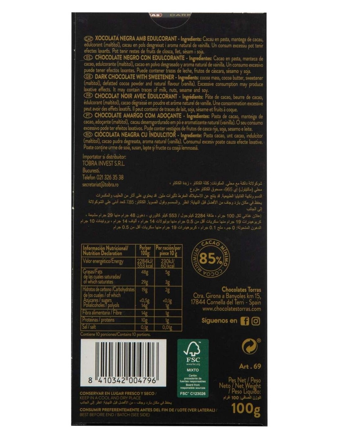 Chocolate Cacao 85% Zero 100Gr de Torras