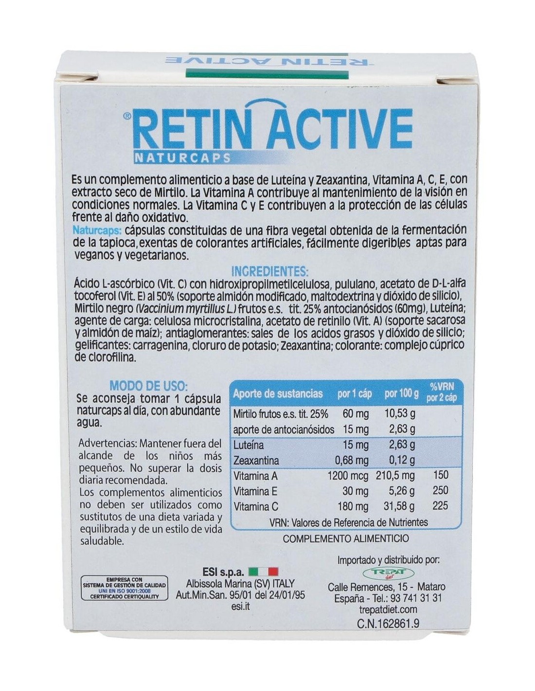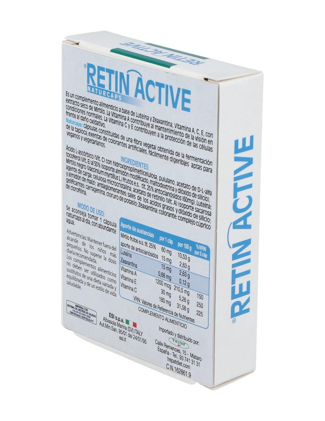 Retin Active es un complemento alimenticio especialmente formulado para conseguir beneficiar a la actividad visual. Gracias a su formulación rica en arándanos, vitaminas antioxidantes A, C, y E, y un gran aporte de luteína unida a zeaxantina, consigue proteger la estructura ocular.