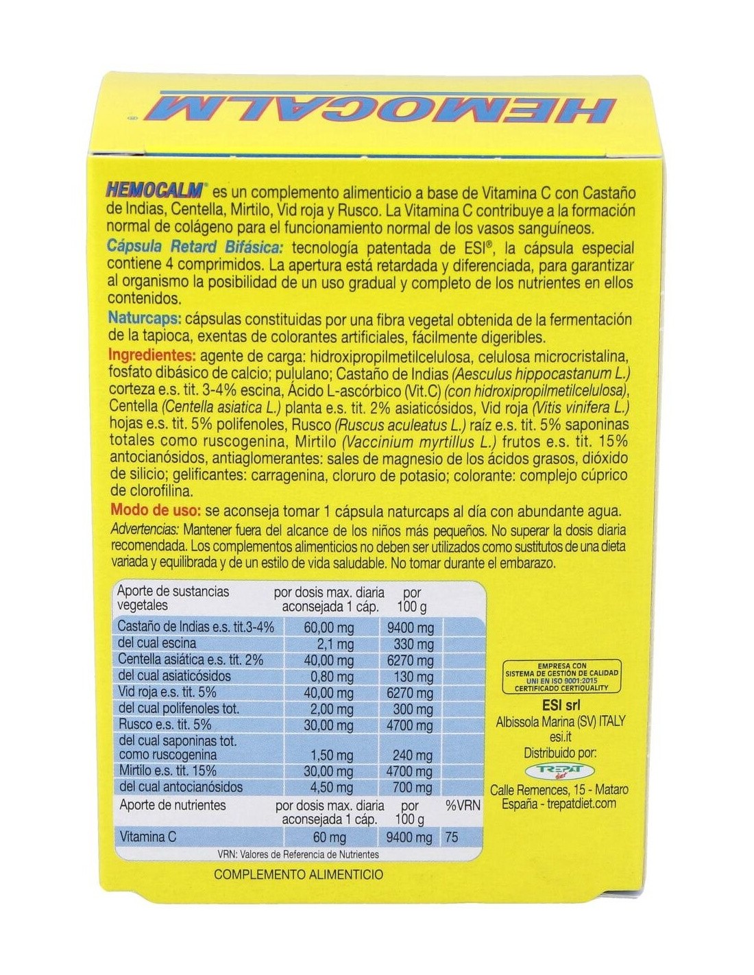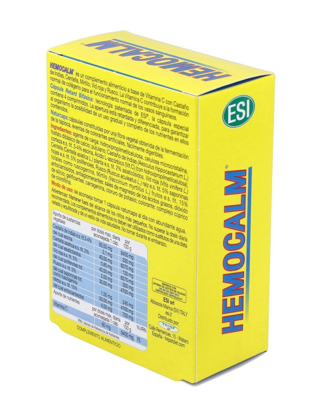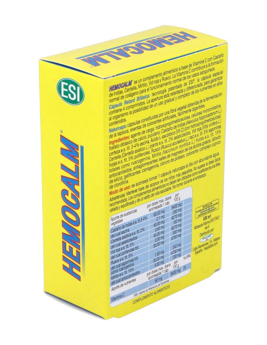 Castaño de indias, corteza, extr. seco (tit. 3-4% escina) / vitamina C / centella asiática, hojas, extr. seco (tit. 2% asiaticósidos) / vid roja, hojas (extr. seco tit. 5% polifenol) / mirtilo, bayas, extr. seco 15% antocianósidos / rusco, raíz, extr. seco tit.(5% saponinas) / castaño de indias, corteza, extr. seco (tit. 3-4% escina)