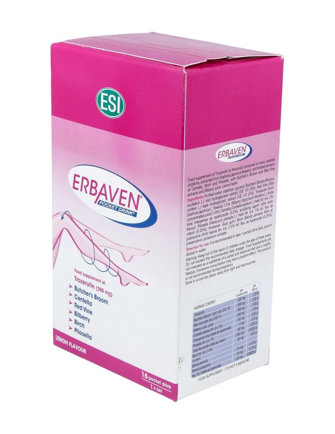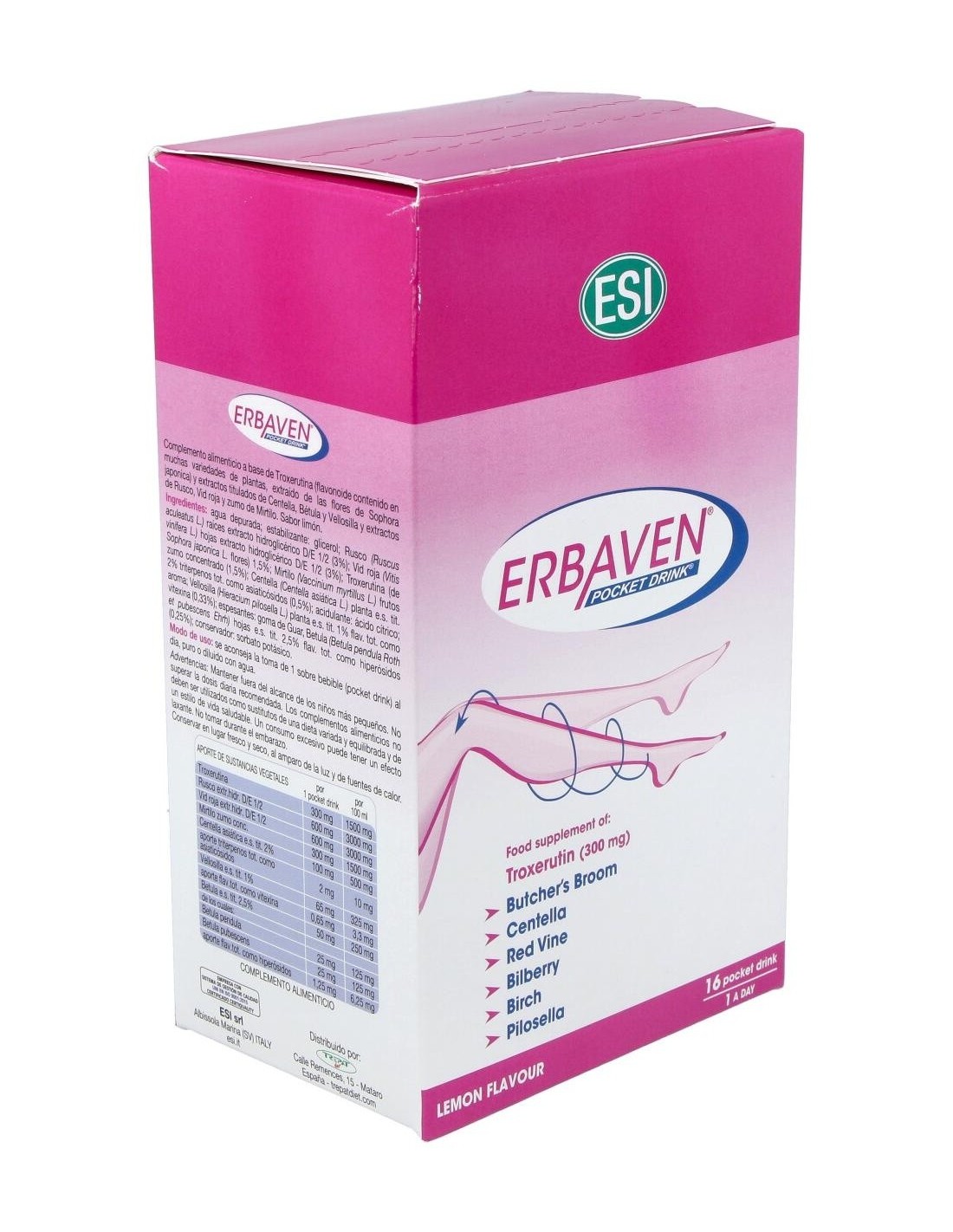 Erbaven Pocket Drink es un suplemento dietético indicado para el tratamiento de problemas circulatorios en las extremidades inferiores. Mejora el riego sanguíneo para que tus piernas se sientan ligeras y descansadas, evitando varices y flevitis.