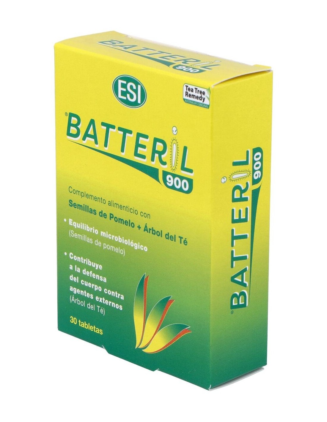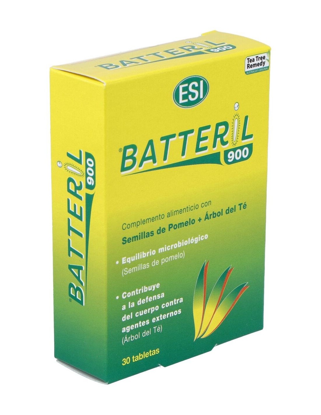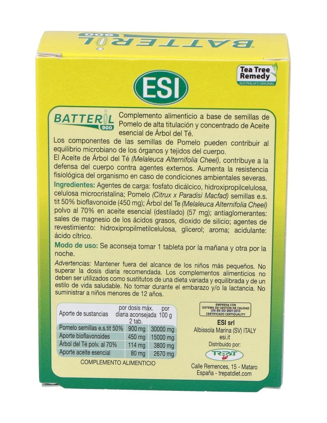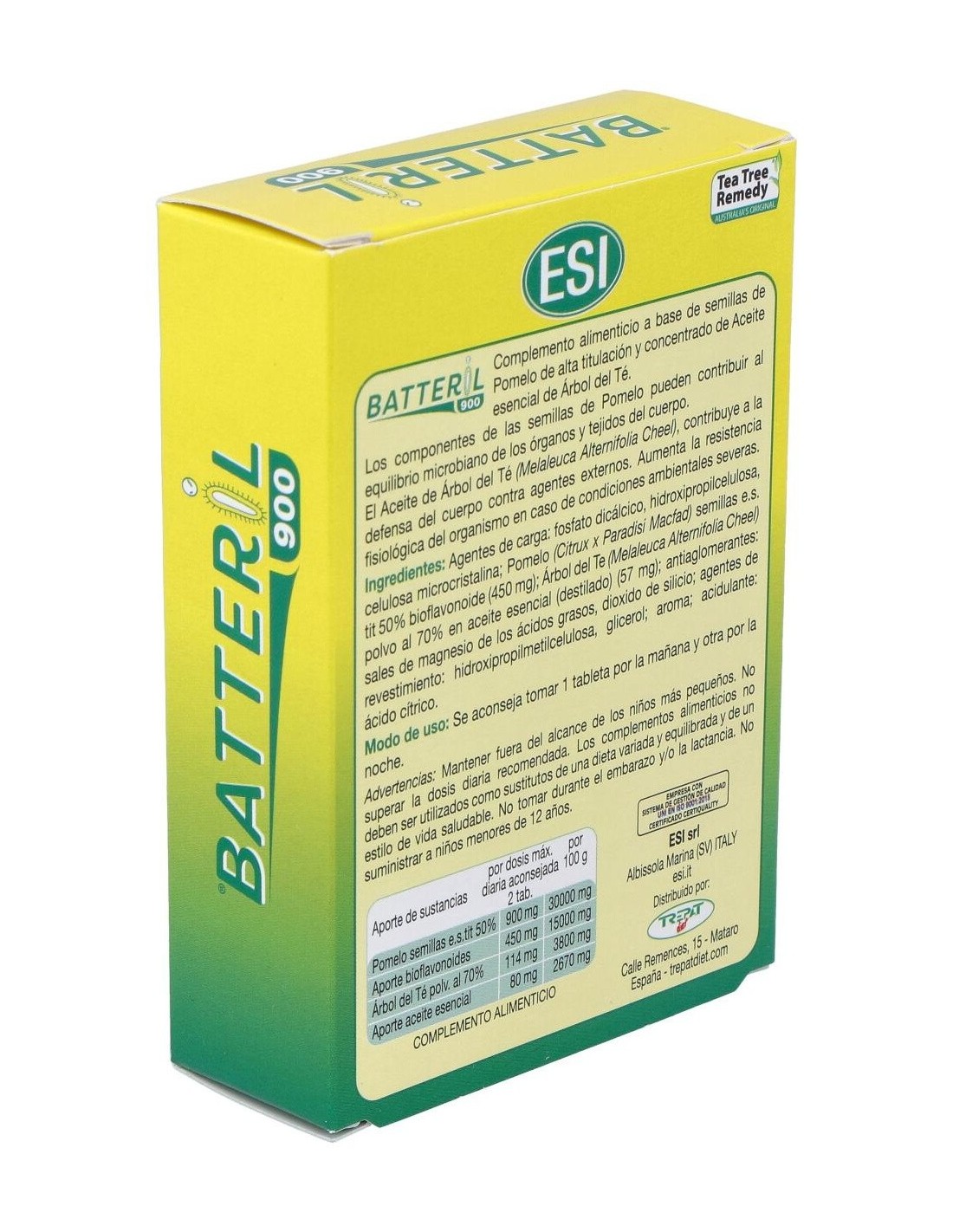 ESI Batteril 900 Árbol Del Té 30Comp complemento alimenticio en forma de comprimidos a base de extractos de semilla de Pomelo y aceite esencial de Árbol de Té. Ideal para contrarrestar las infecciones más comunes.