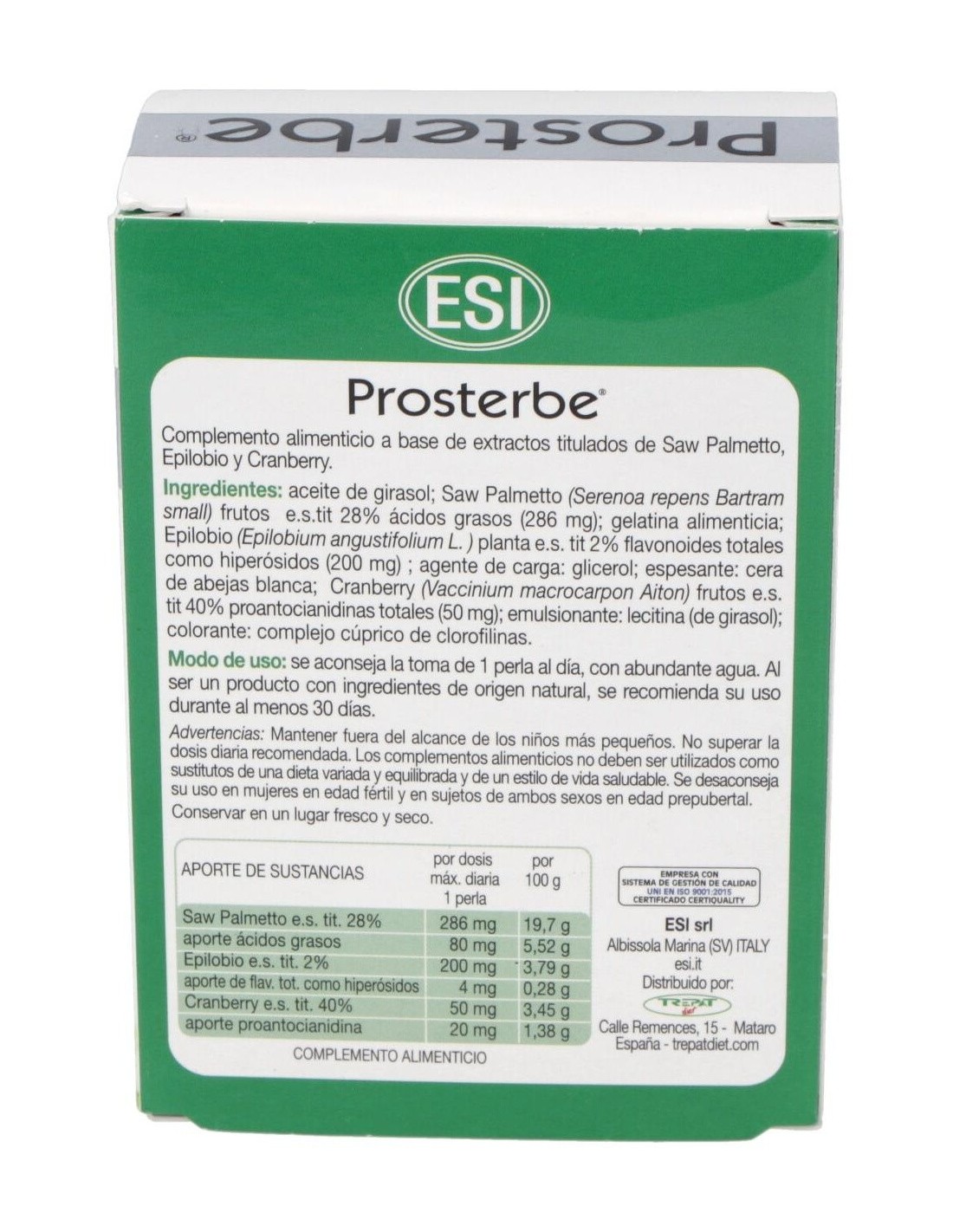 Prosterbe 30prl es un complemento alimenticio que da soporte y mantiene el bienestar de la próstata. Formulado a base de Epilobium, Saw Palmetto y Cranberry (40% de proantocianidinas) que contribuyen a promover el bienestar del tracto urinario.