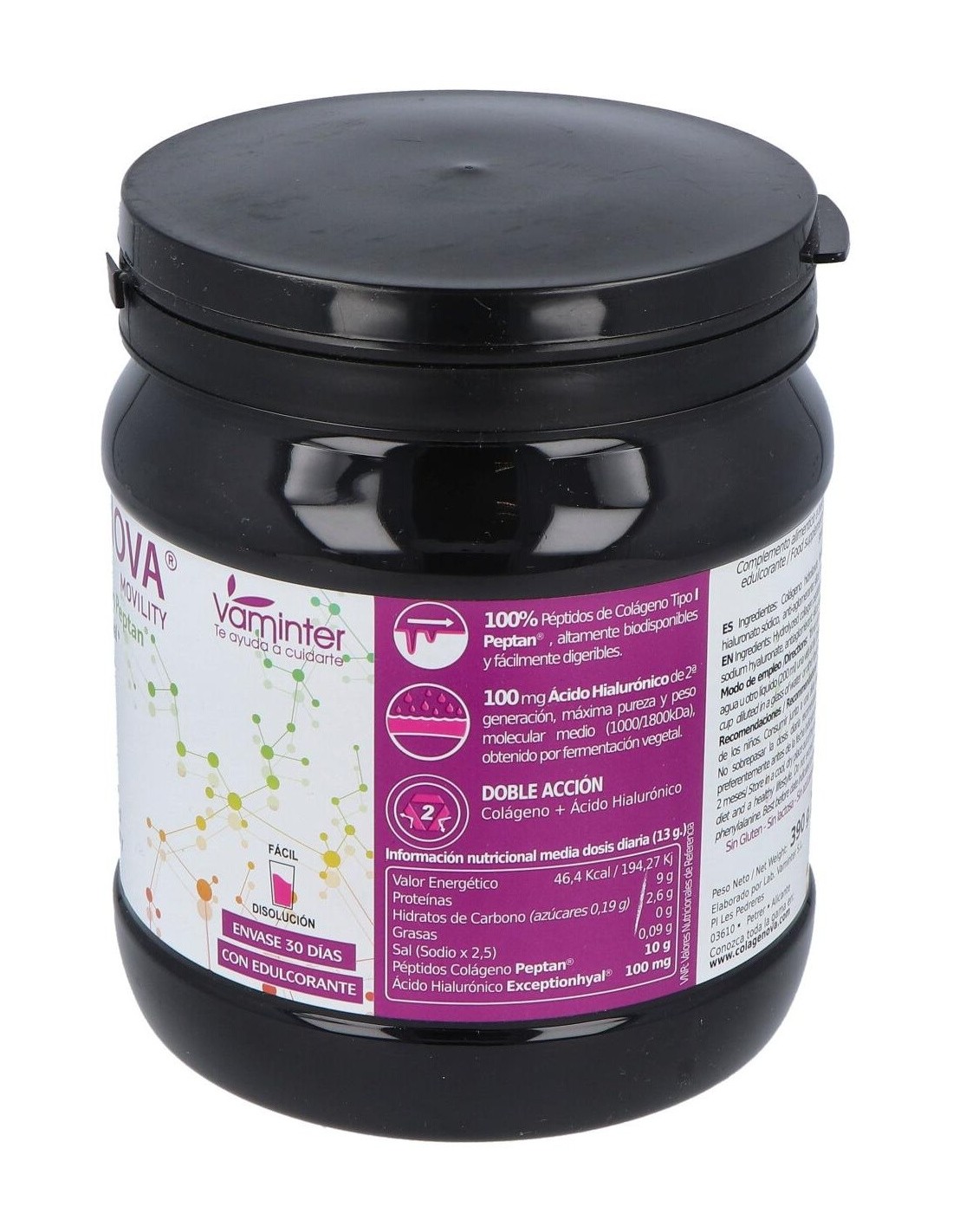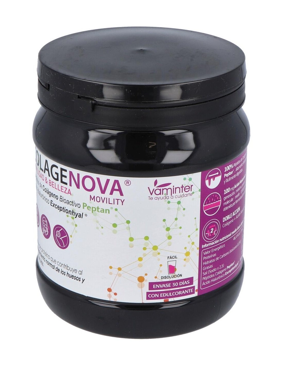 Colagenova Movility de Vaminter es un complemento alimenticio a base de colágeno hidrolizado que ayuda a mejorar el estado de los huesos, las articulaciones, el cabello y las uñas en un plazo de, más o menos, 21 días.