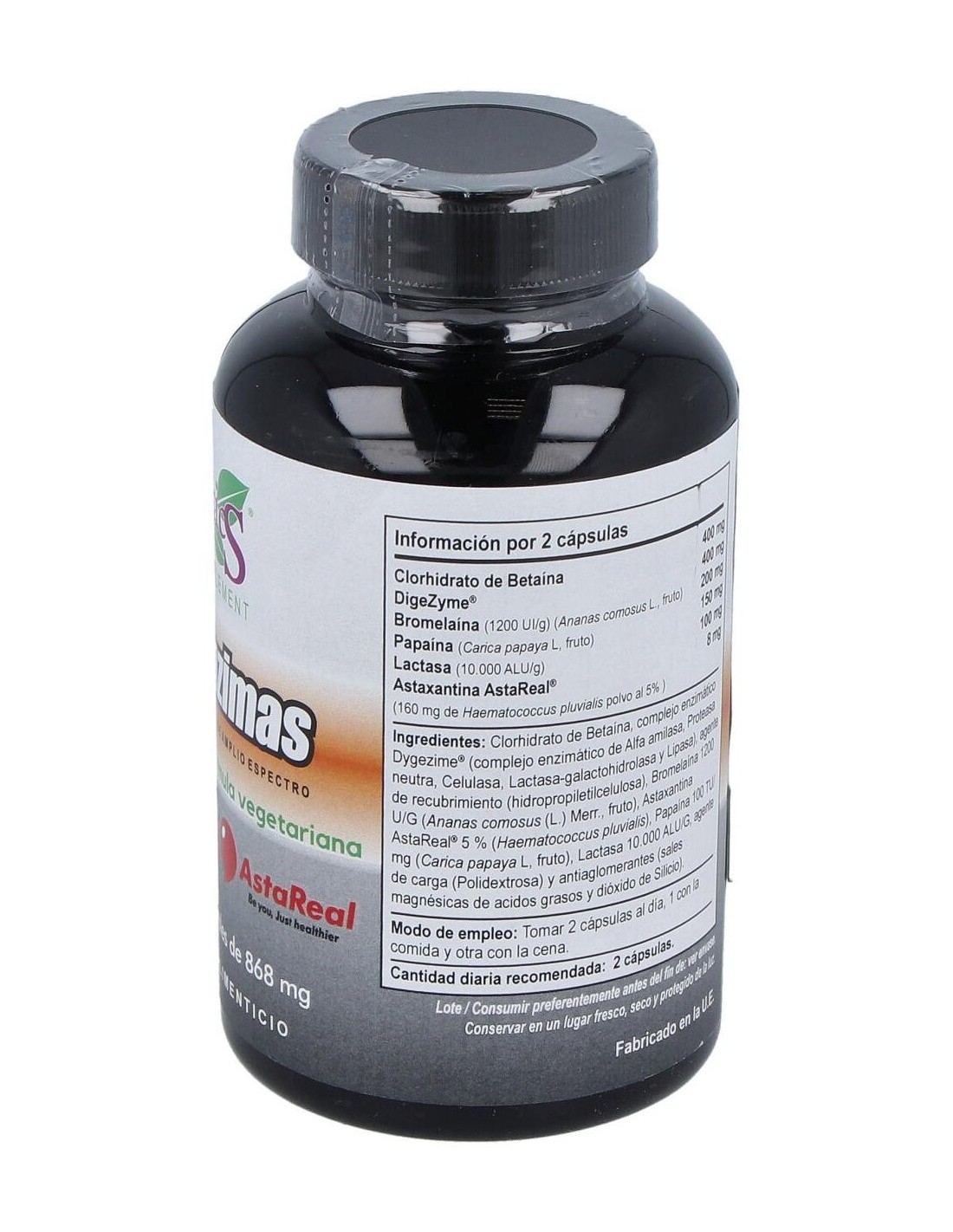 Clorhidrato de Betaína, complejo enzimático Dygezime® (complejo enzimático de Alfa amilasa, Proteasa neutra, Celulasa, Lactasa-galactohidrolasa y Lipasa), agente de recubrimiento (hidropropiletilcelulosa), Bromelaína 1200 U/G (Ananas comosus (L.) Merr., fruto), Astaxantina AstaReal® 5 % (Haematococcus pluvialis), Papaína 100 TU/ mg (Carica papaya L, fruto), Lactasa 10.000 ALU/G, agente de carga (Polidextrosa) y antiaglomerantes (sales magnésicas de acidos grasos y dióxido de Silicio).