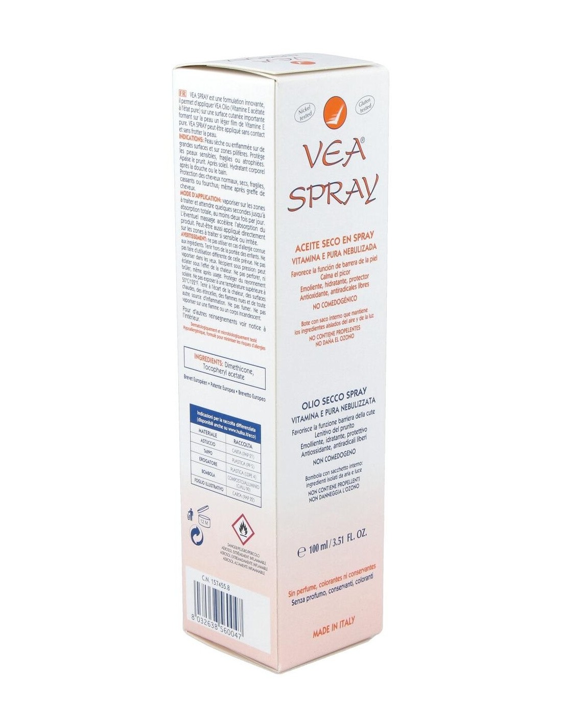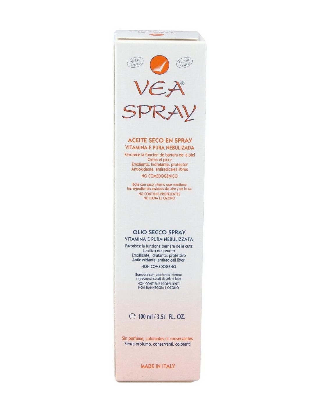 Vea Spray 100ml se trata de un aceite seco en formato spray elaborado a base de Vitamina E pura nebulizada. Indicado especialmente para pieles secas o enrojecidas. Su aplicación es muy sencilla y colabora con la prevención y atenuacón de estrías y como desmaquillante, incluso con el resistente al agua. No comedogénico. Actúa como hidratante tras la ducha y además, protege el cabello. No contiene agua, conservantes, perfumes, aceites esenciales ni colorantes, para minimizar el riesgo de alergias.