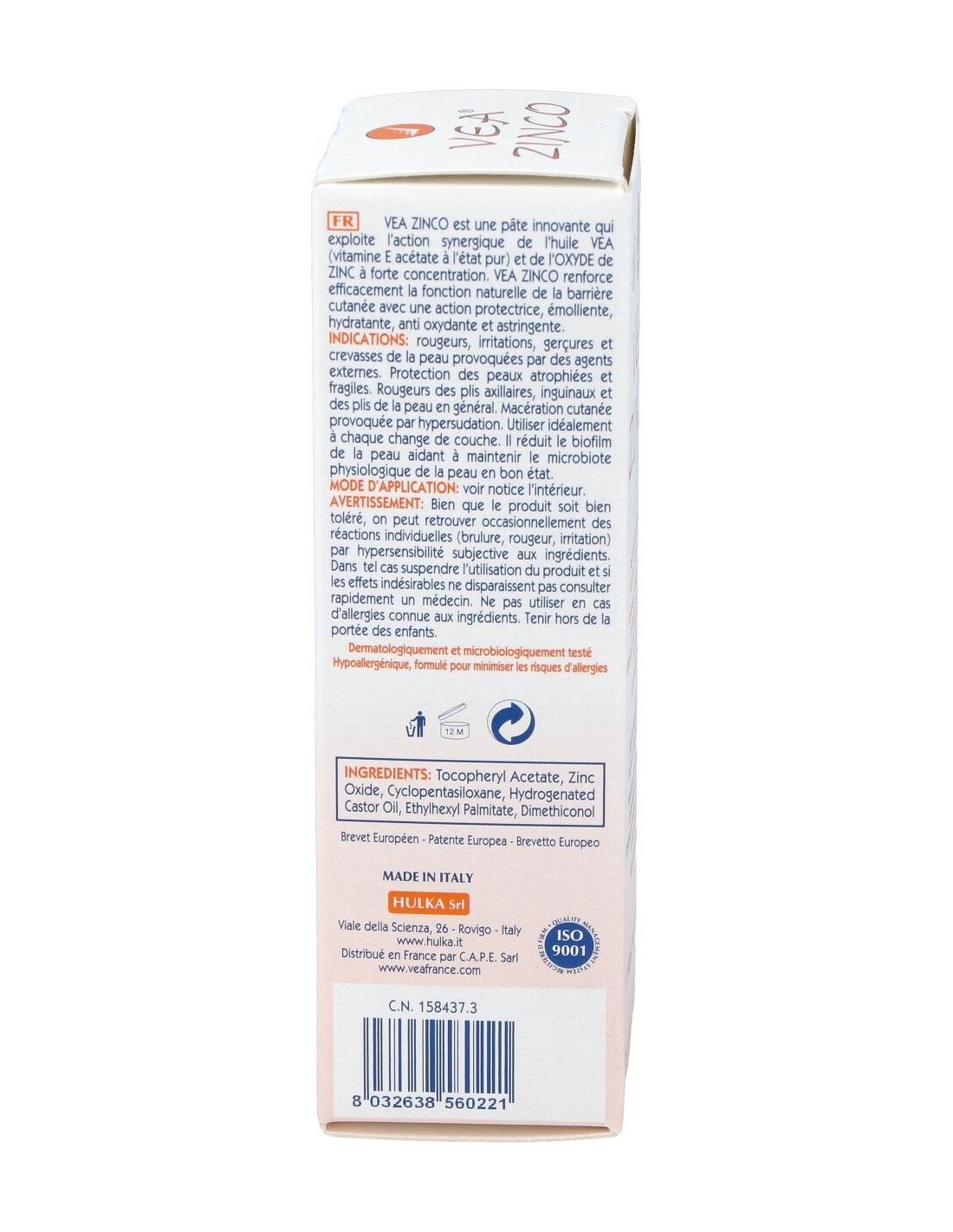 La pasta protectora Vea Zinco es perfecta para restaurar la piel dañada o irritada por culpa de cualquier agente externo (calor, frío...). Indicada, sobre todo, para las zonas de axilas, inglés o para el culito del bebé. ¡Un tratamiento hipoalergénico que calma intensamente el picor y repara la zona afectada hasta que se normaliza tu textura!. Enriquecida con vitamina E y óxido de Zinc, dos componentes reparadores que refuerzan la función de barrera en la piel y equilibran su pH.