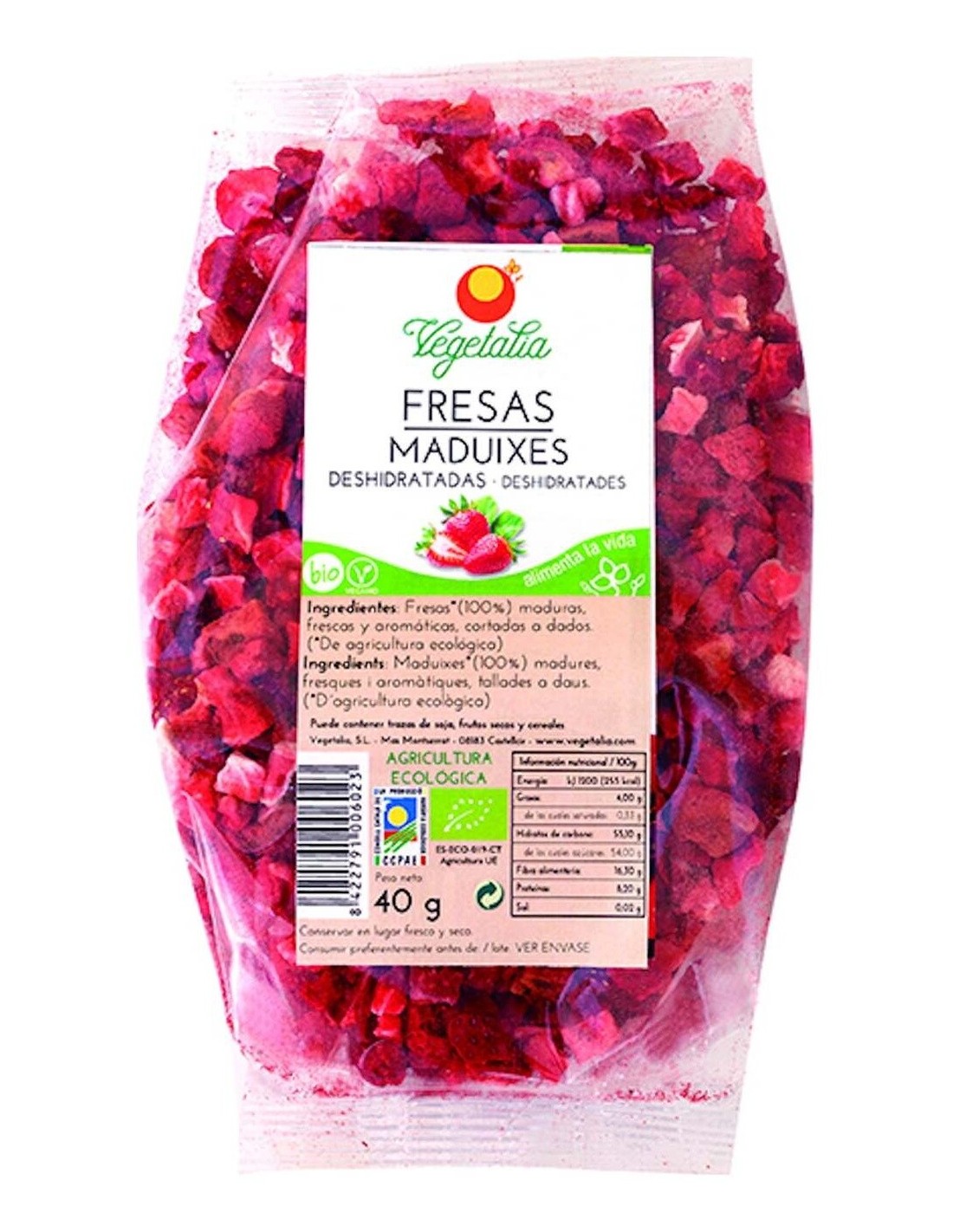 VEGETALIATrozos de fresa liofilizada 100% naturales, con ingredientes procedentes de cultivos ecológicos. Son ricas en ácido fólico, hierro, calcio, yodo, fósforo, magnesio, potasio y fibra.