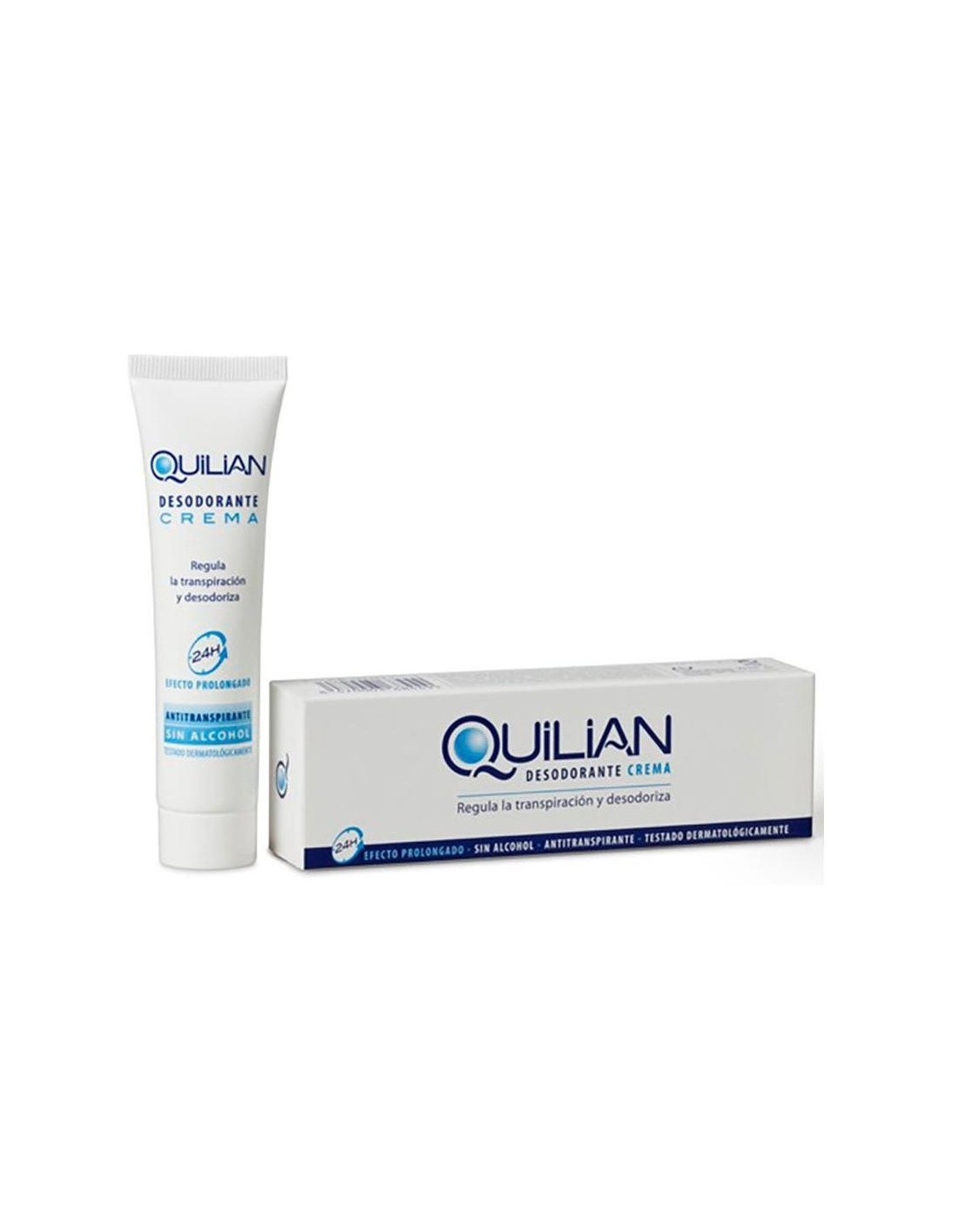 VIÑASQuilian Desodorante Crema regula la transpiración corporal y evita la descomposición del sudor, suprimiendo el desagradable olor característico. Su textura suave y penetrante no mancha ni engrasa la piel. No contiene alcohol. Quilian Desodorante Crema se presenta en forma de tubo con aplicador, lo que asegura la máxima higiene y comodidad de uso.\ La potente acción de Quilian Desodorante Crema consigue que una sola aplicación del producto sea suficiente para que sus efectos se mantengan las 24 horas del día.